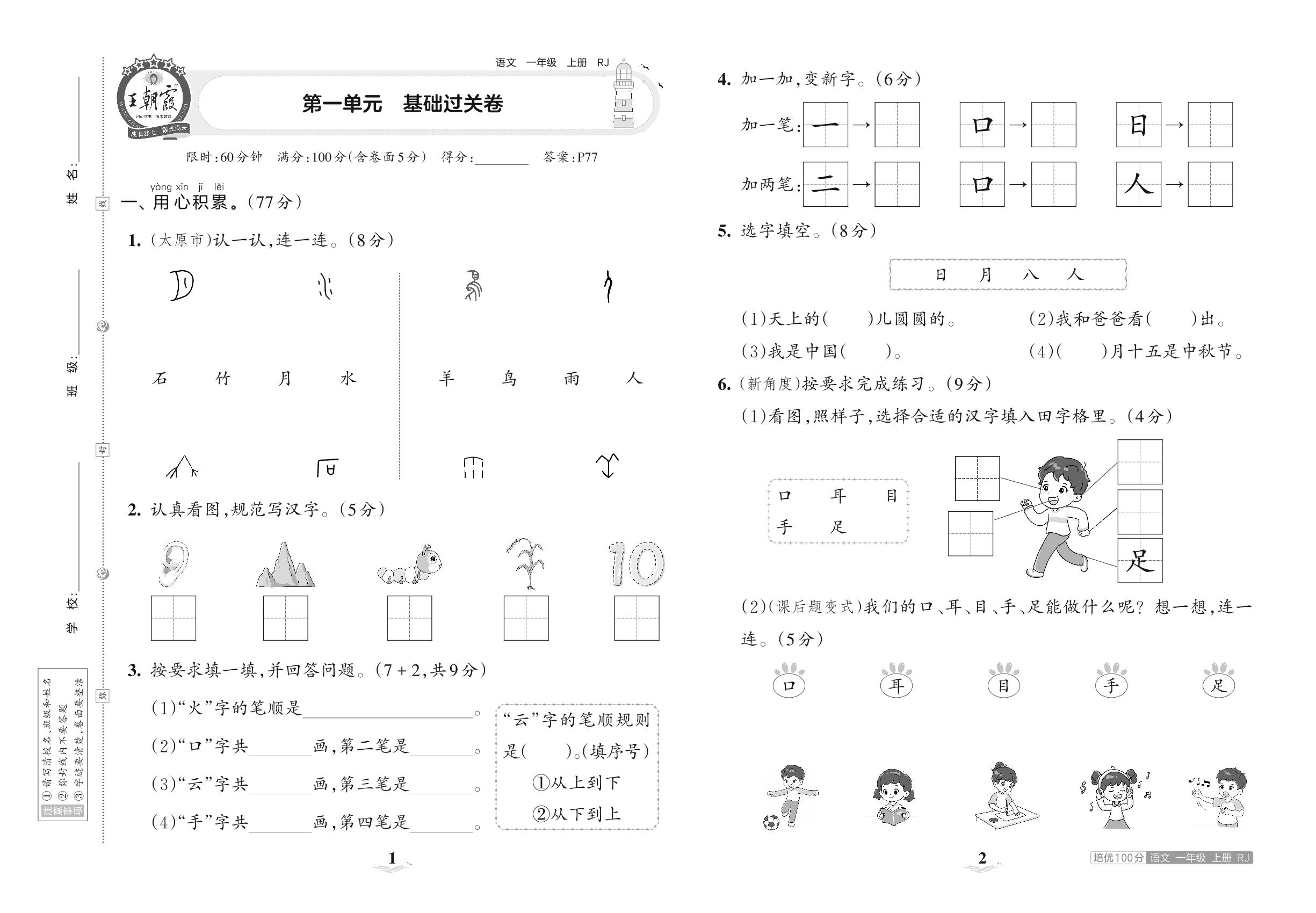 2023上册一年级语文人教版 第一单元 基础过关卷