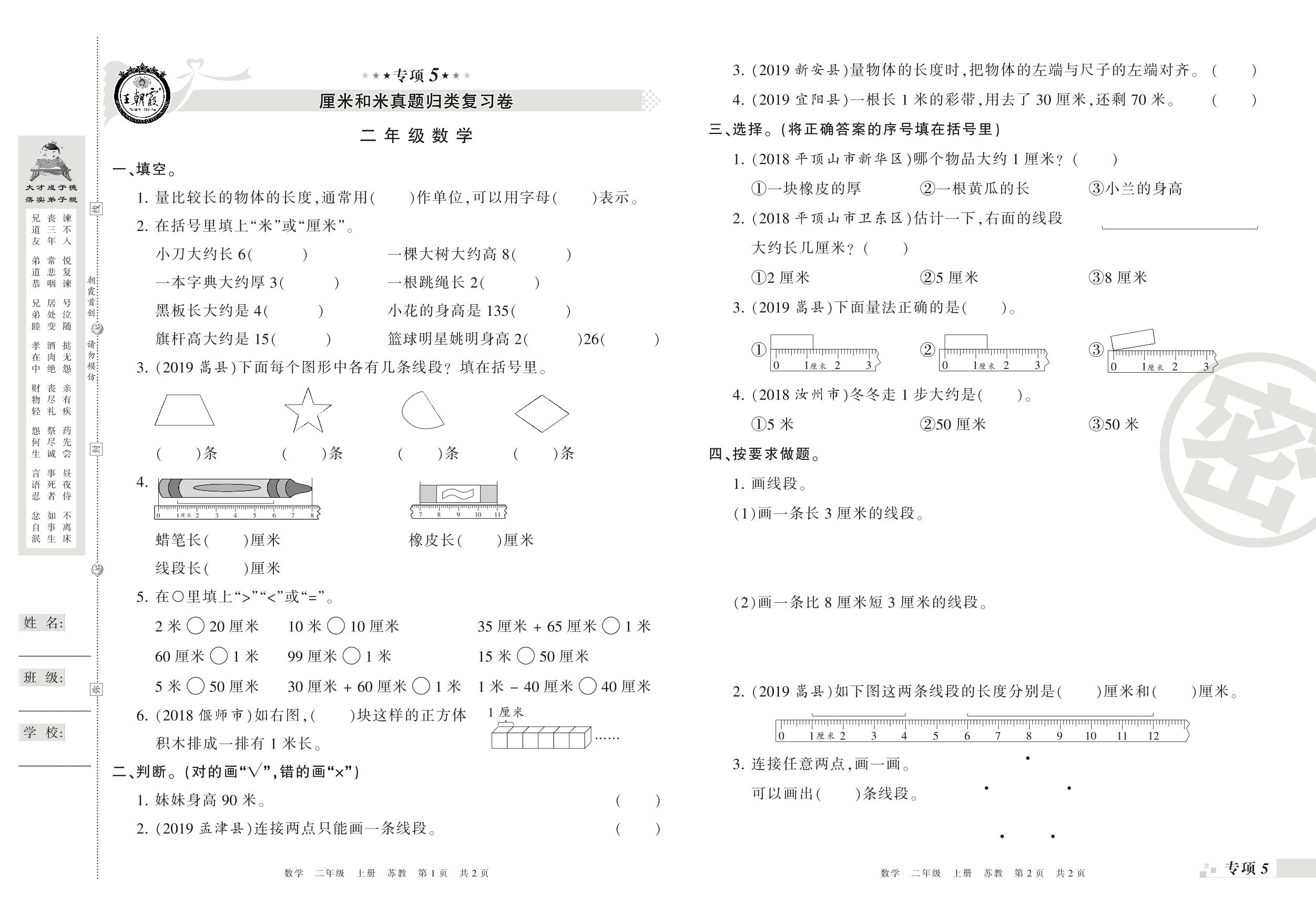 王朝霞期末专项卷——厘米和米、表内乘法和表内除法真题归类复习二年级上册数学(苏教版)_R21080392247【0】