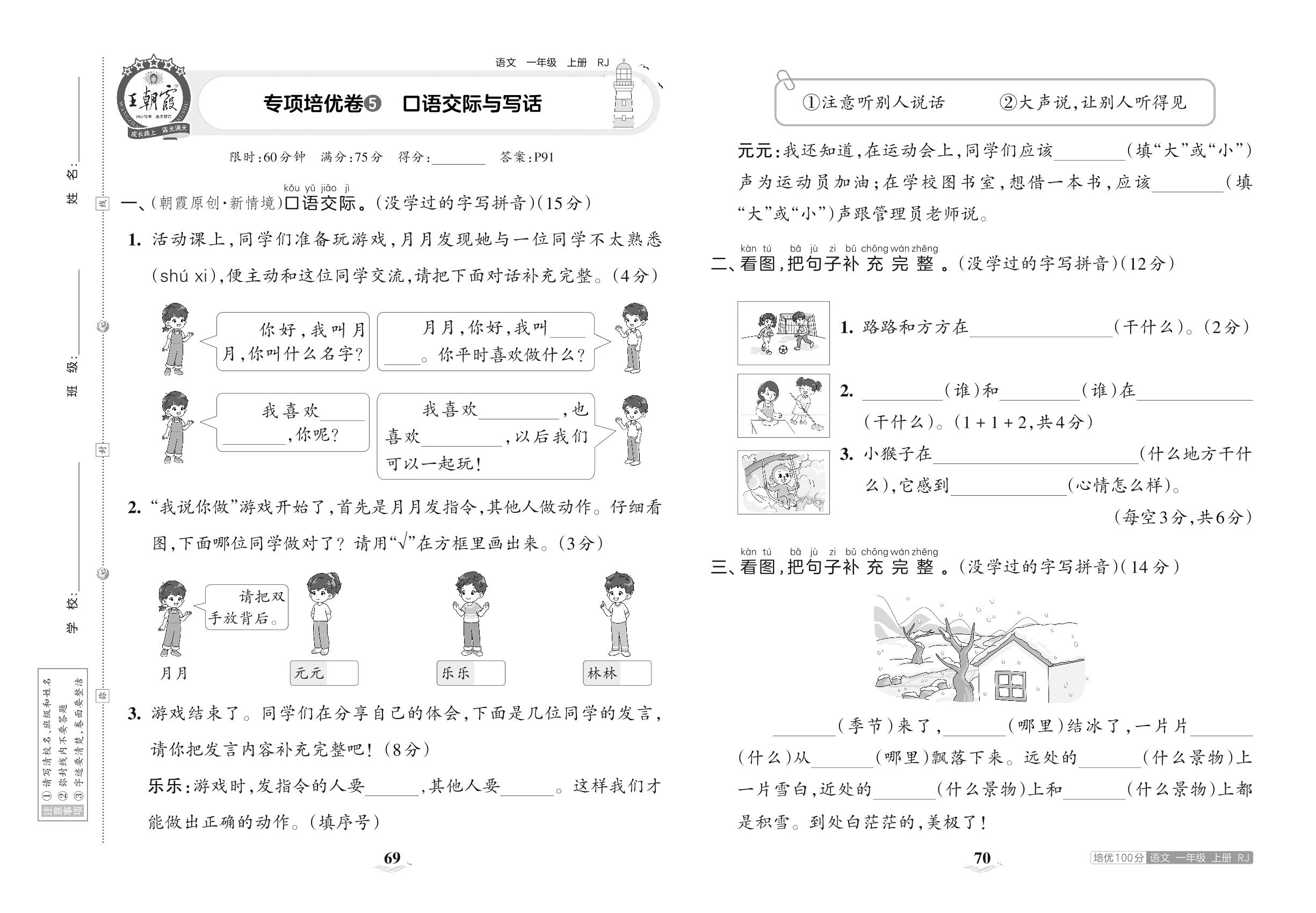 2023上册一年级语文人教版 专项培优卷5 口语交际与写话