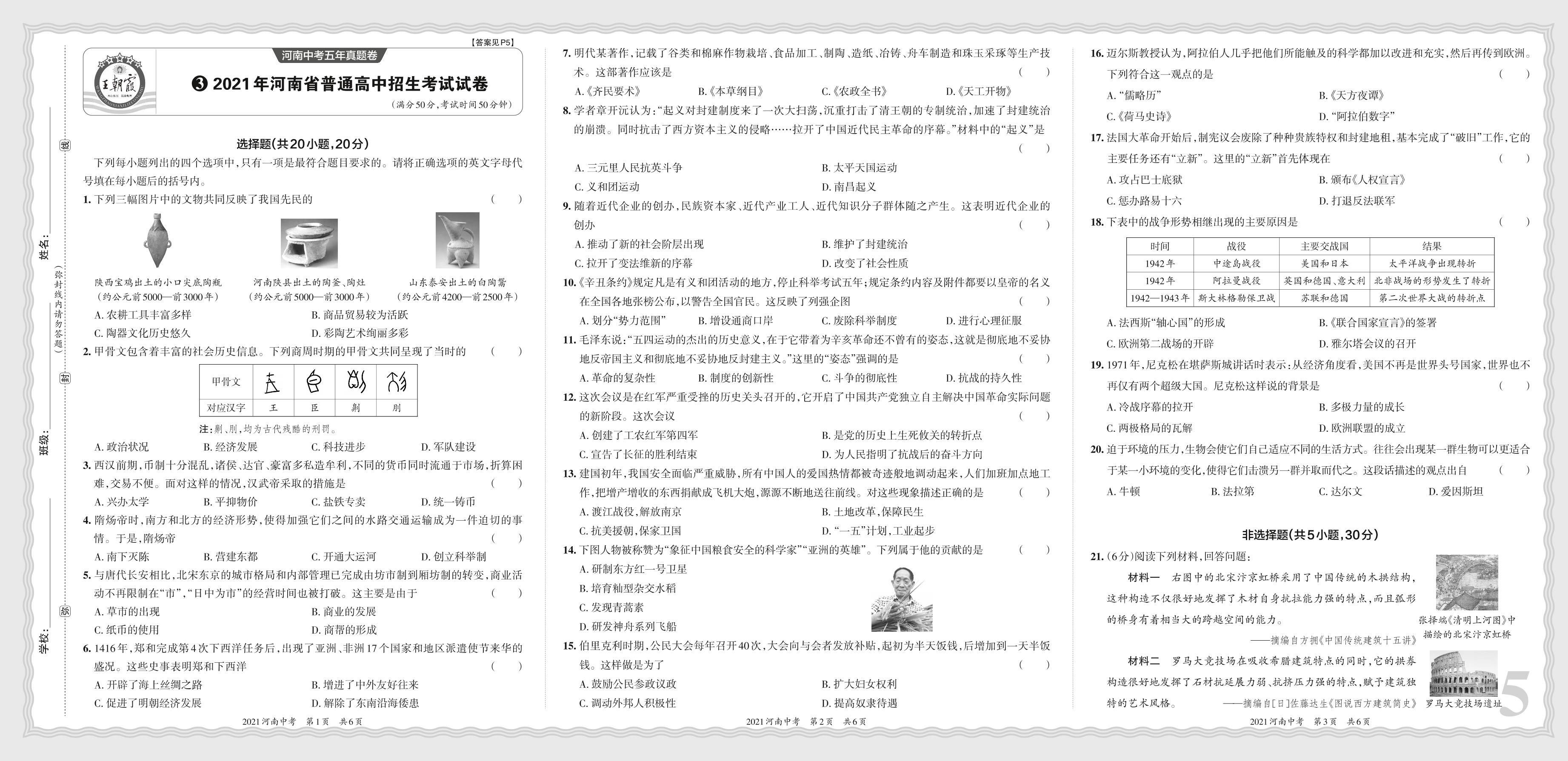 2021年河南省普通高中招生考试试卷·历史【3】
