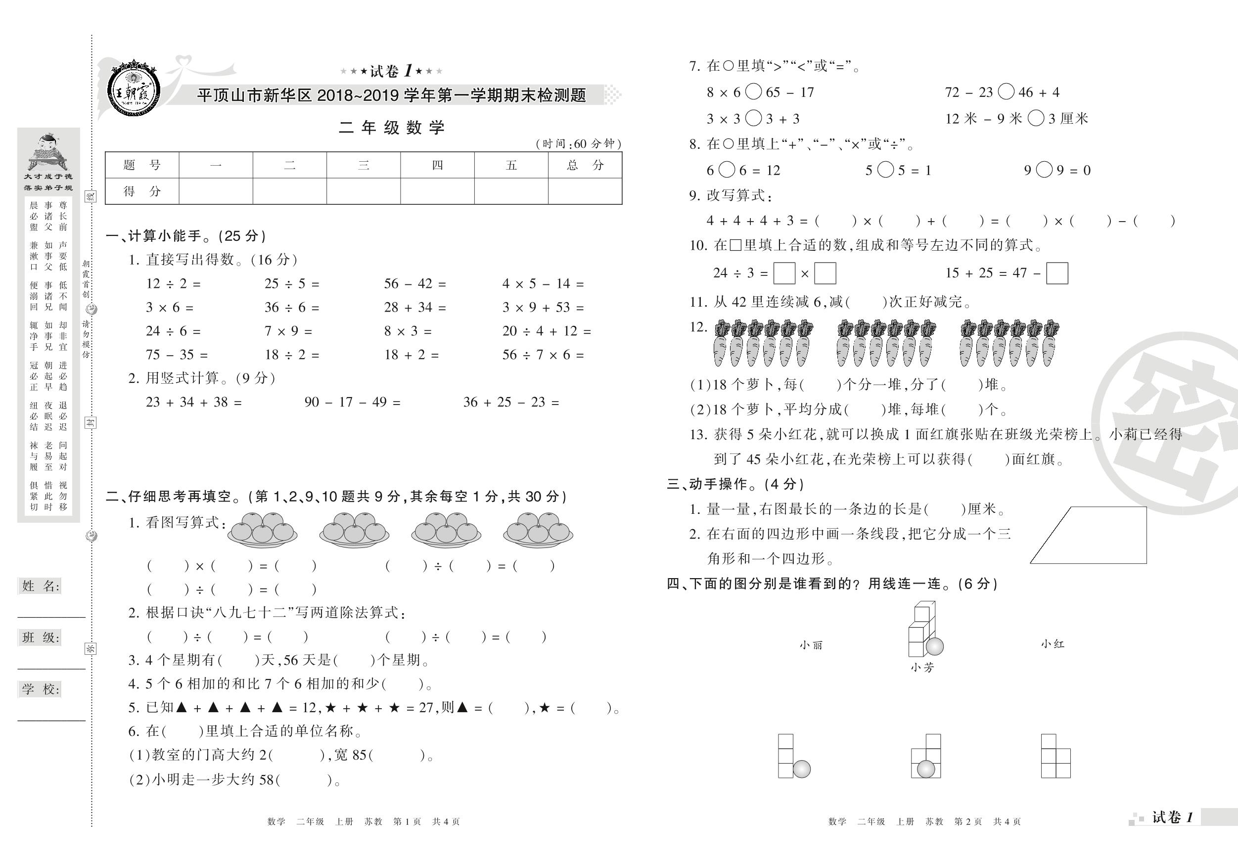 2018-2019学年第一学期平顶山市新华区二年级数学试卷(苏教版)_R21080392255【1】