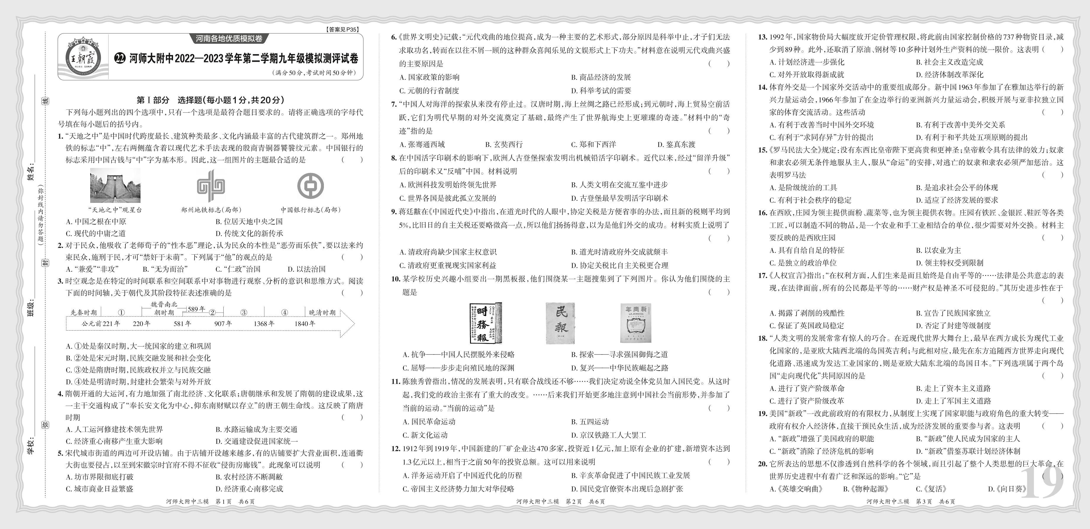 河师大附中2022—2023学年第二学期九年级模拟测评试卷·历史【22】