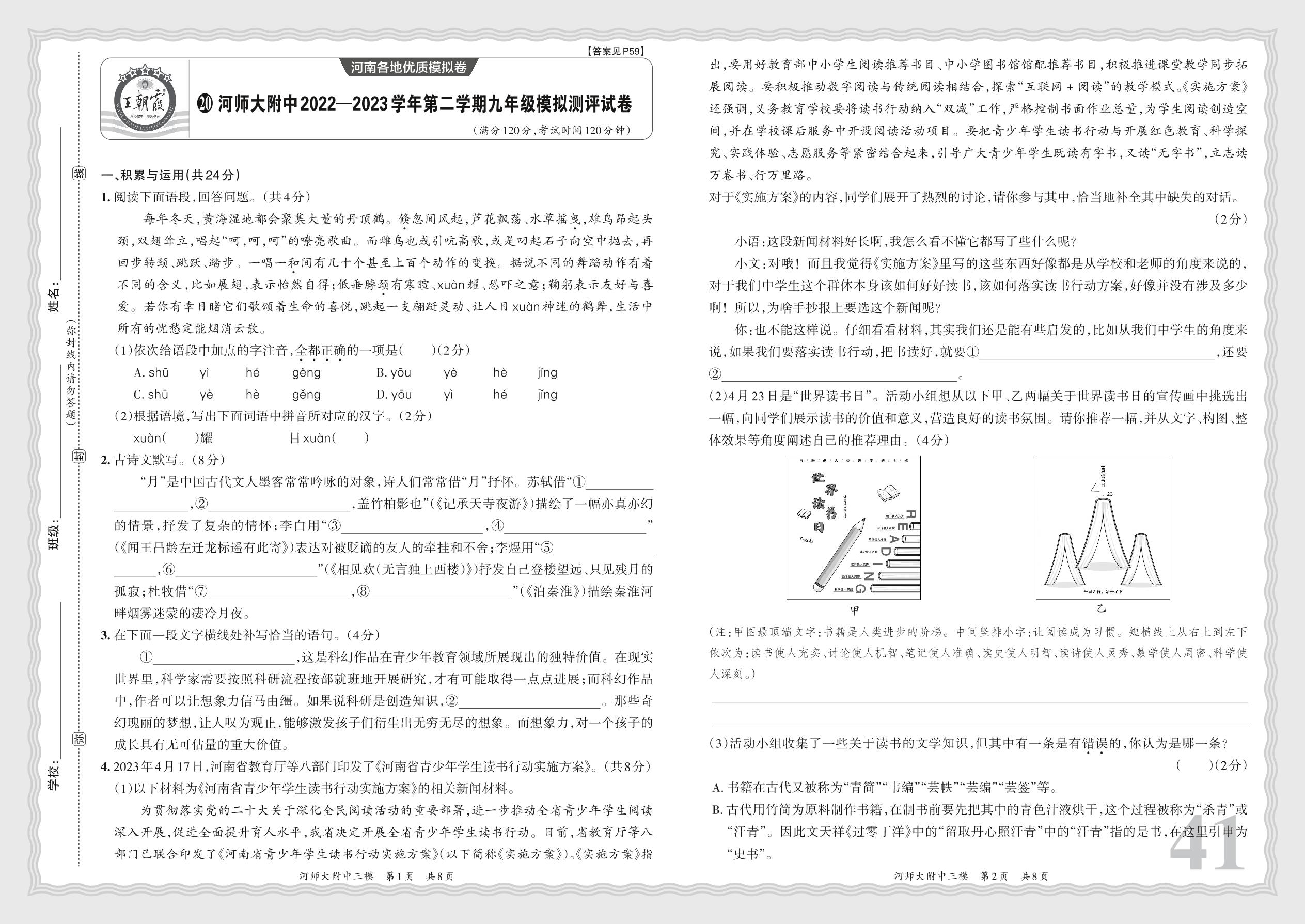 河师大附中2022—2023学年第二学期九年级模拟测评试卷·语文【20】