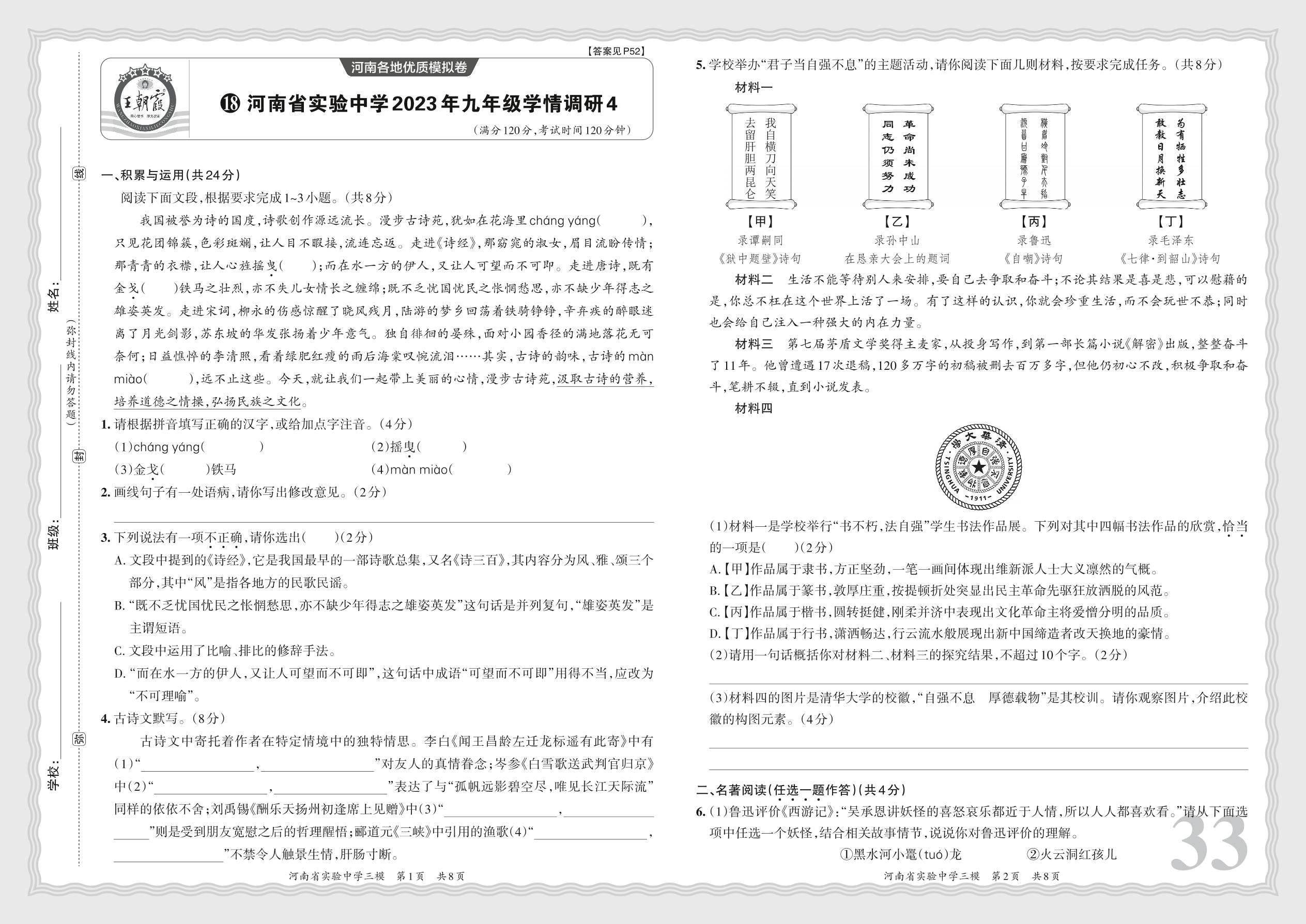河南省实验中学2023年九年级学情调研4·语文【18】
