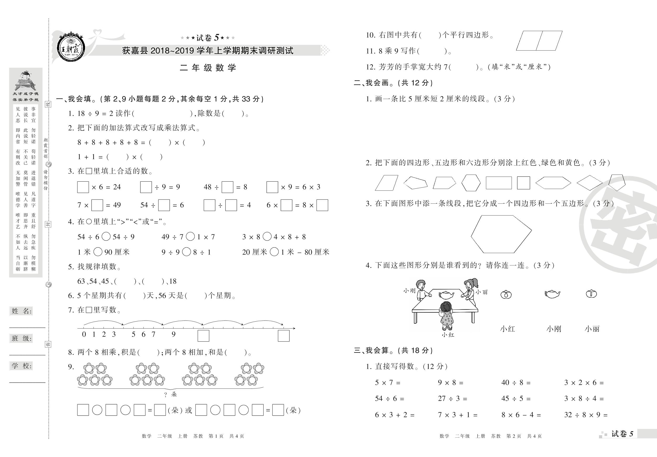 2018-2019学年第一学期新乡市获嘉县二年级数学试卷(苏教版)【5】