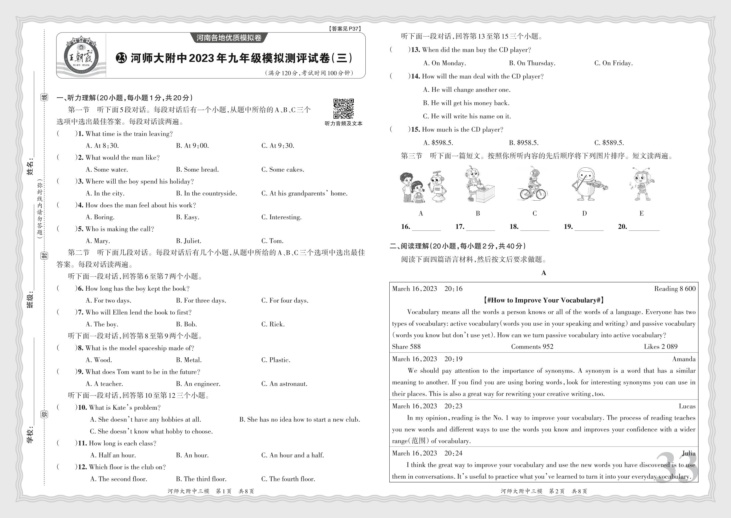 河师大附中2023年九年级模拟测评试卷(三)·英语【23】