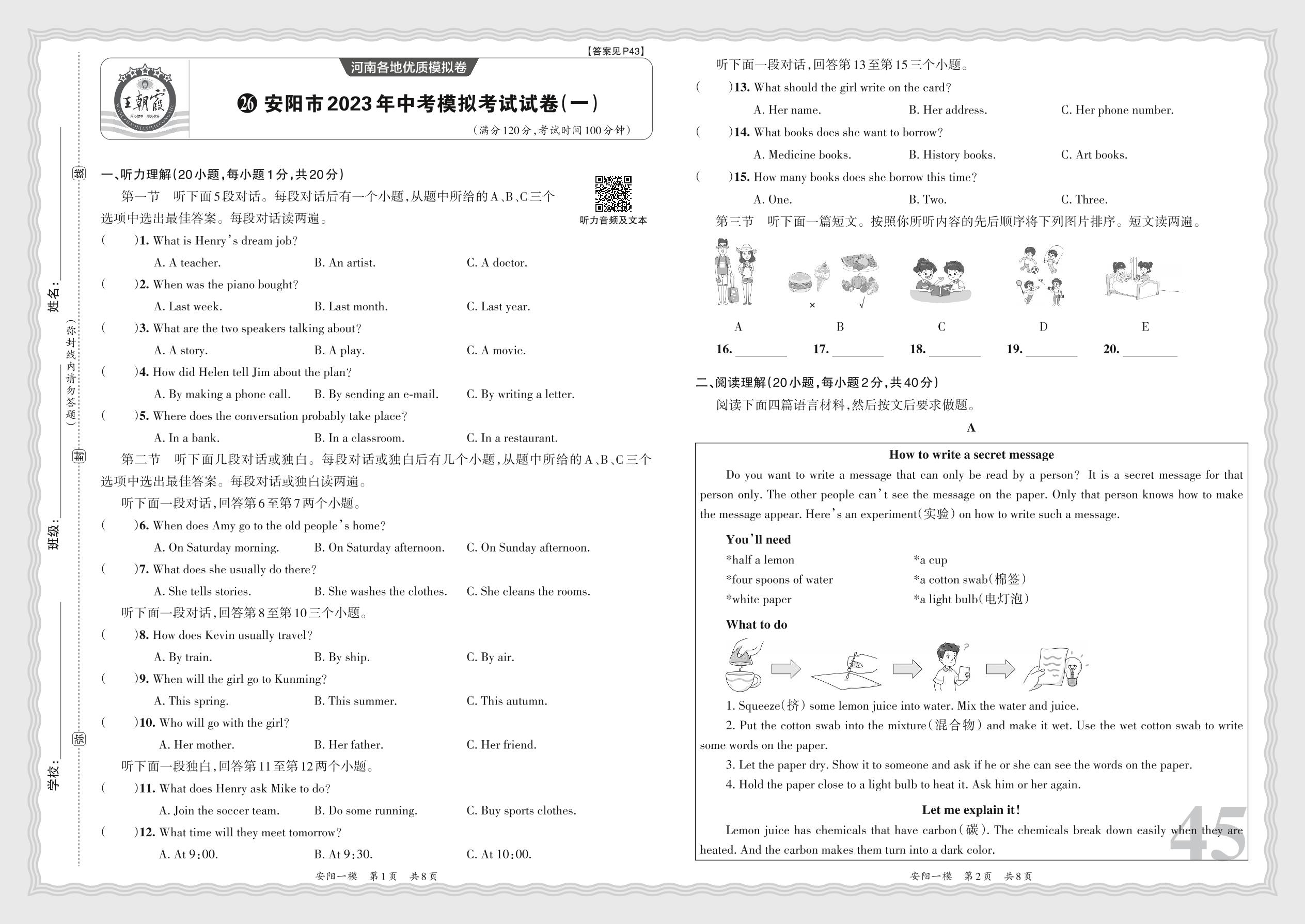 安阳市2023年中考模拟考试试卷(一)·英语【26】
