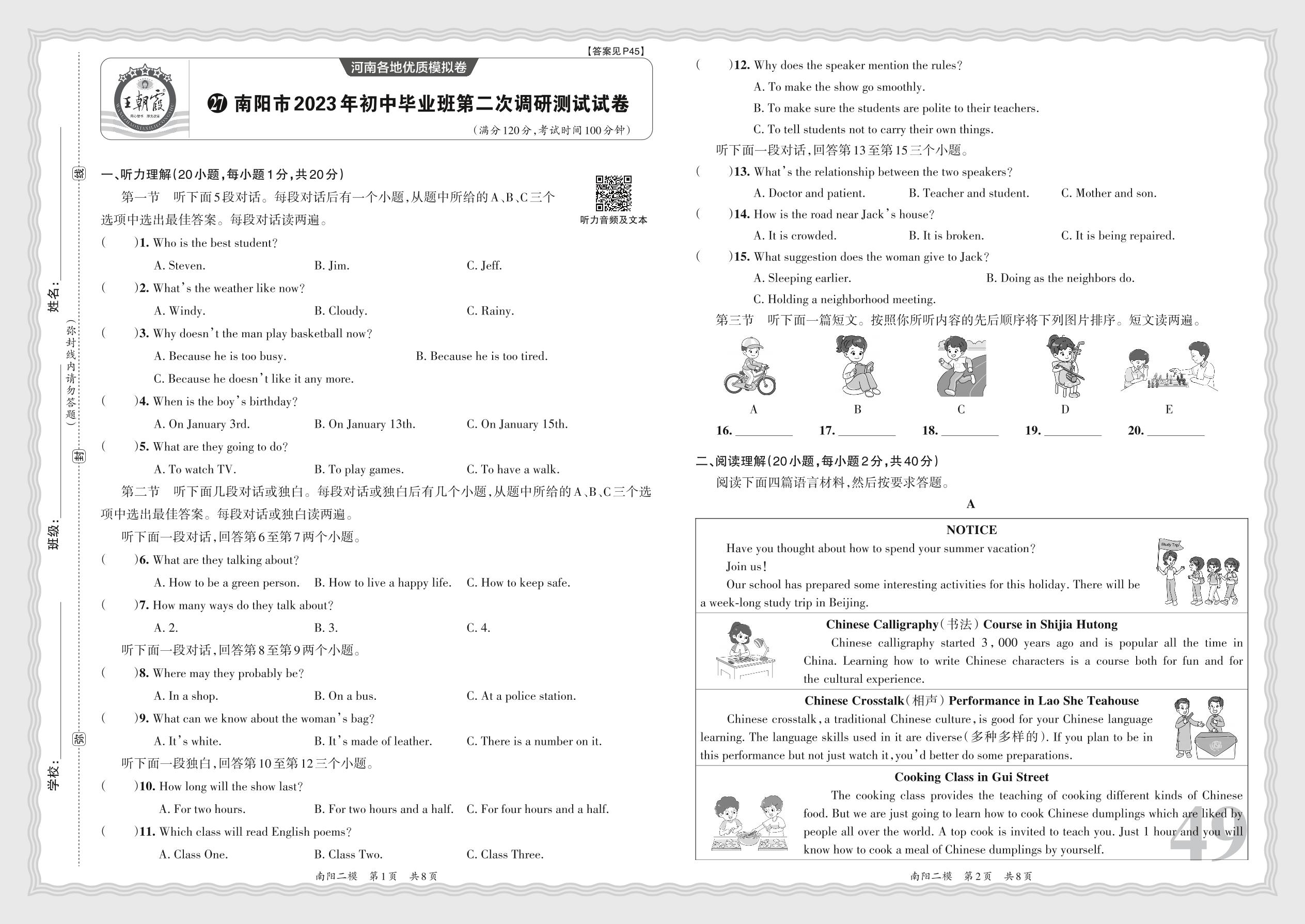 南阳市2023年初中毕业班第二次调研测试试卷·英语【27】
