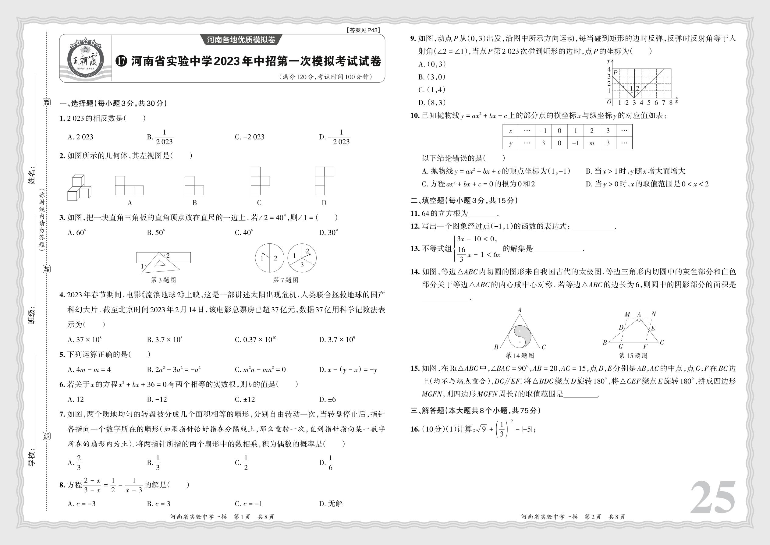 河南省实验中学2023年中招第一次模拟考试试卷·数学【17】