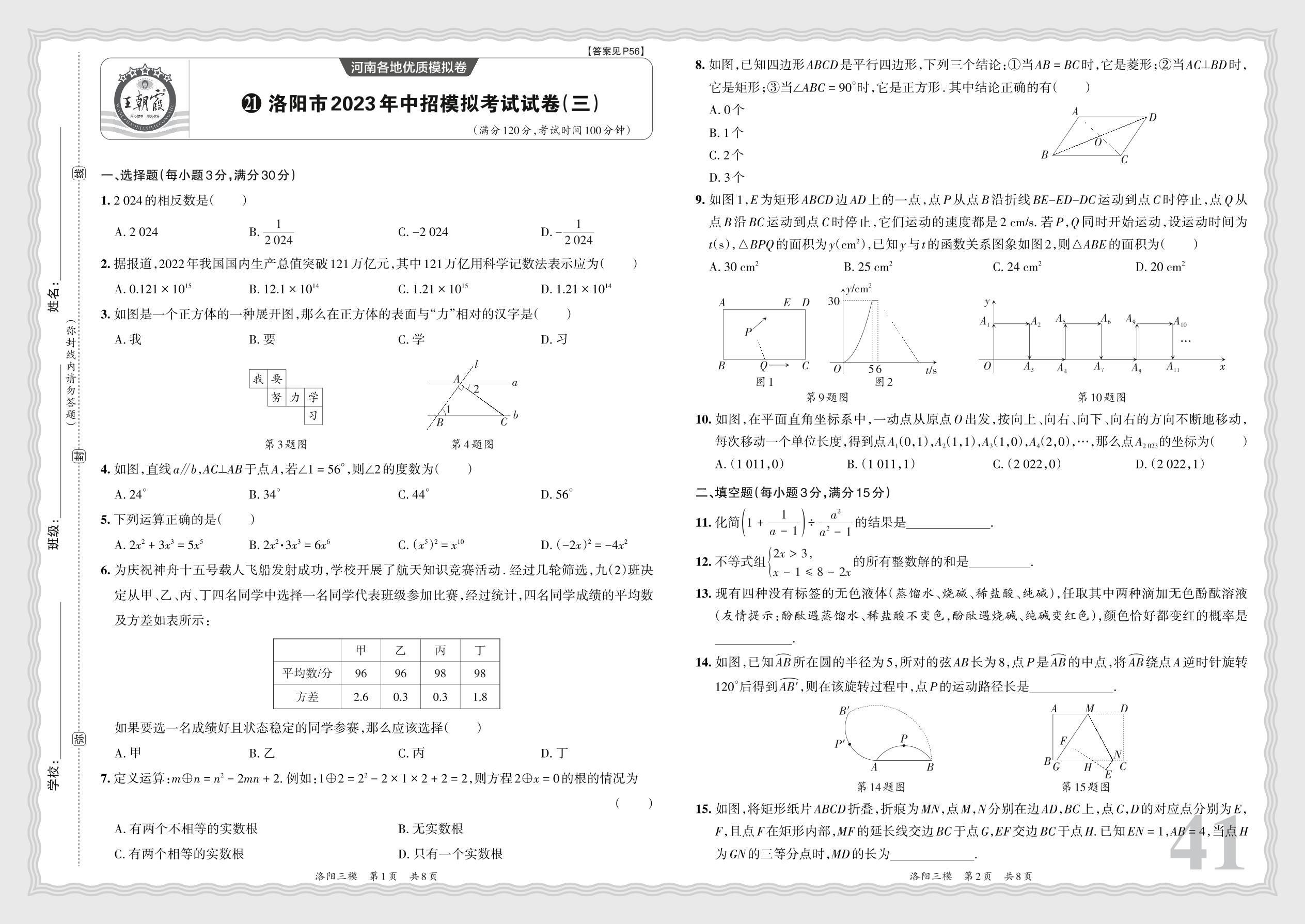 洛阳市2023年中招模拟考试试卷(三)·数学【21】