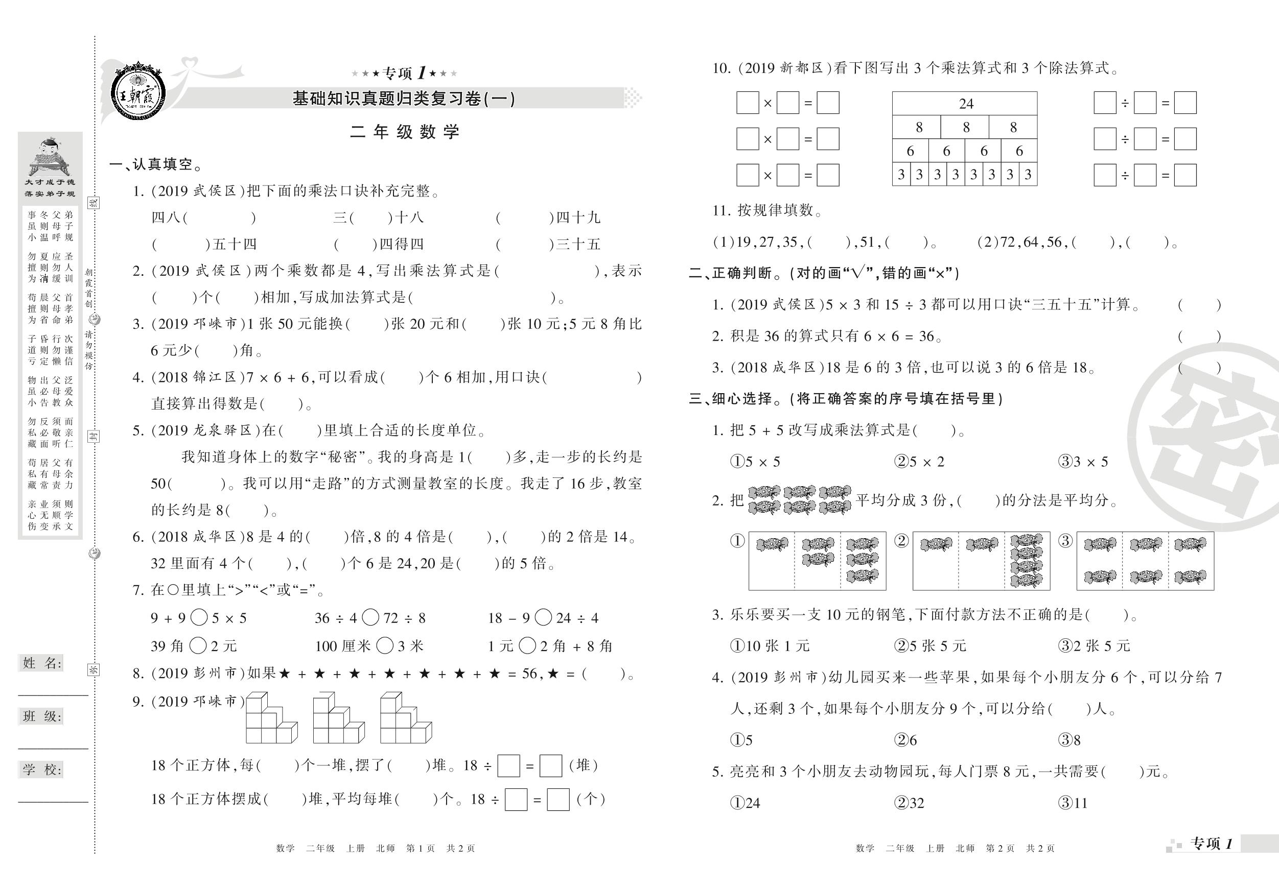 王朝霞期末专项卷——基础知识真题归类复习二年级上册数学(北师版)_R21080392351【0】