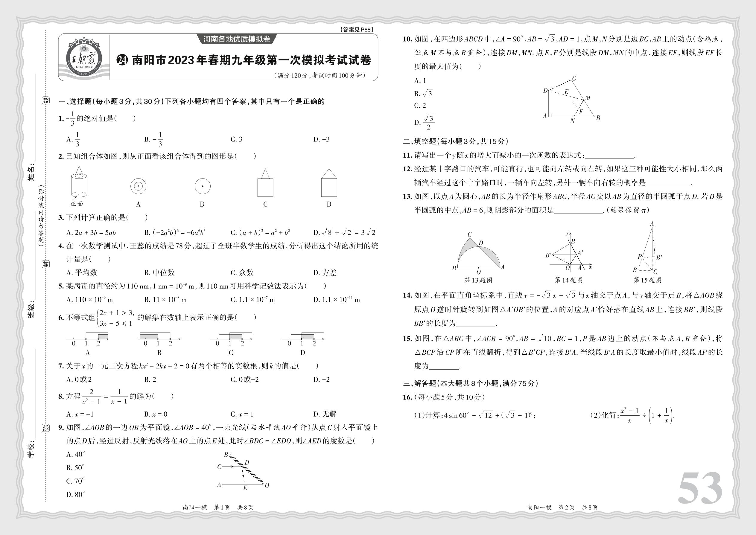 南阳市2023年春期九年级第一次模拟考试试卷·数学【24】