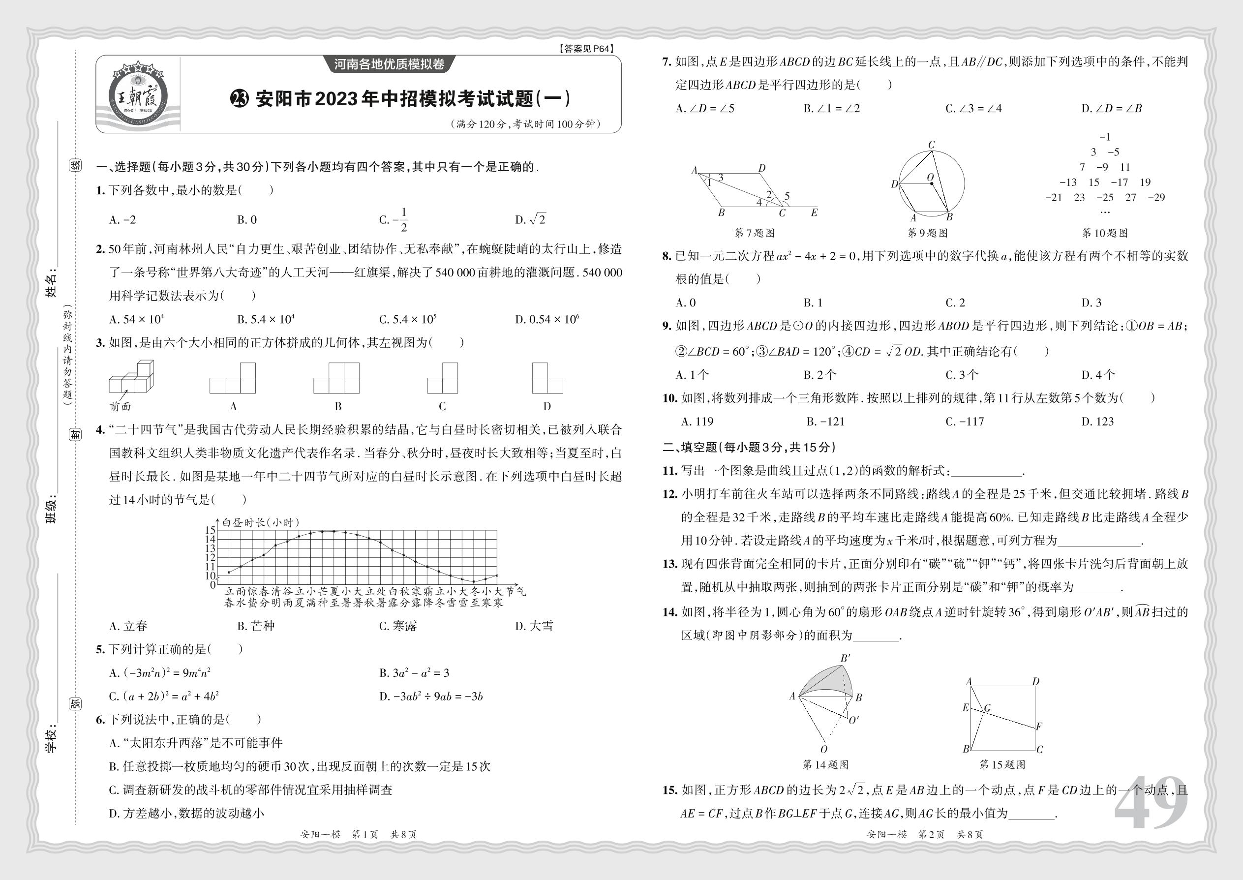 安阳市2023年中招模拟考试试题(一)·数学【23】
