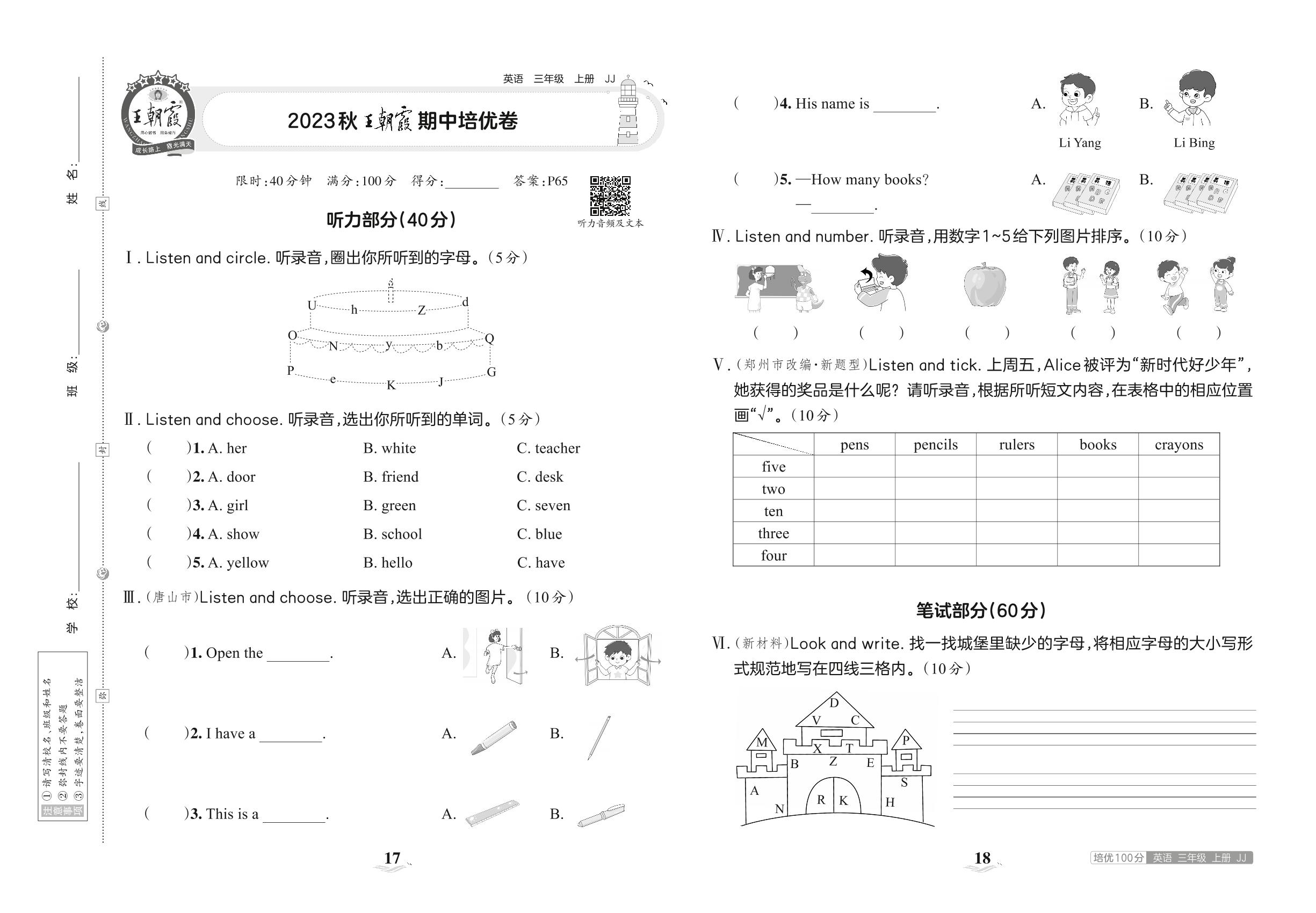 2023上册三年级英语冀教版 2023秋王朝霞期中培优卷