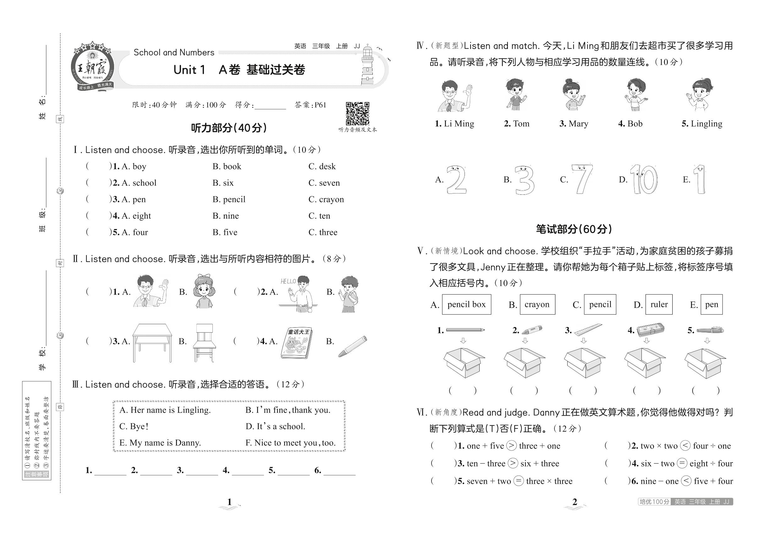 2023上册三年级英语冀教版 Unit 1 A卷 基础过关卷