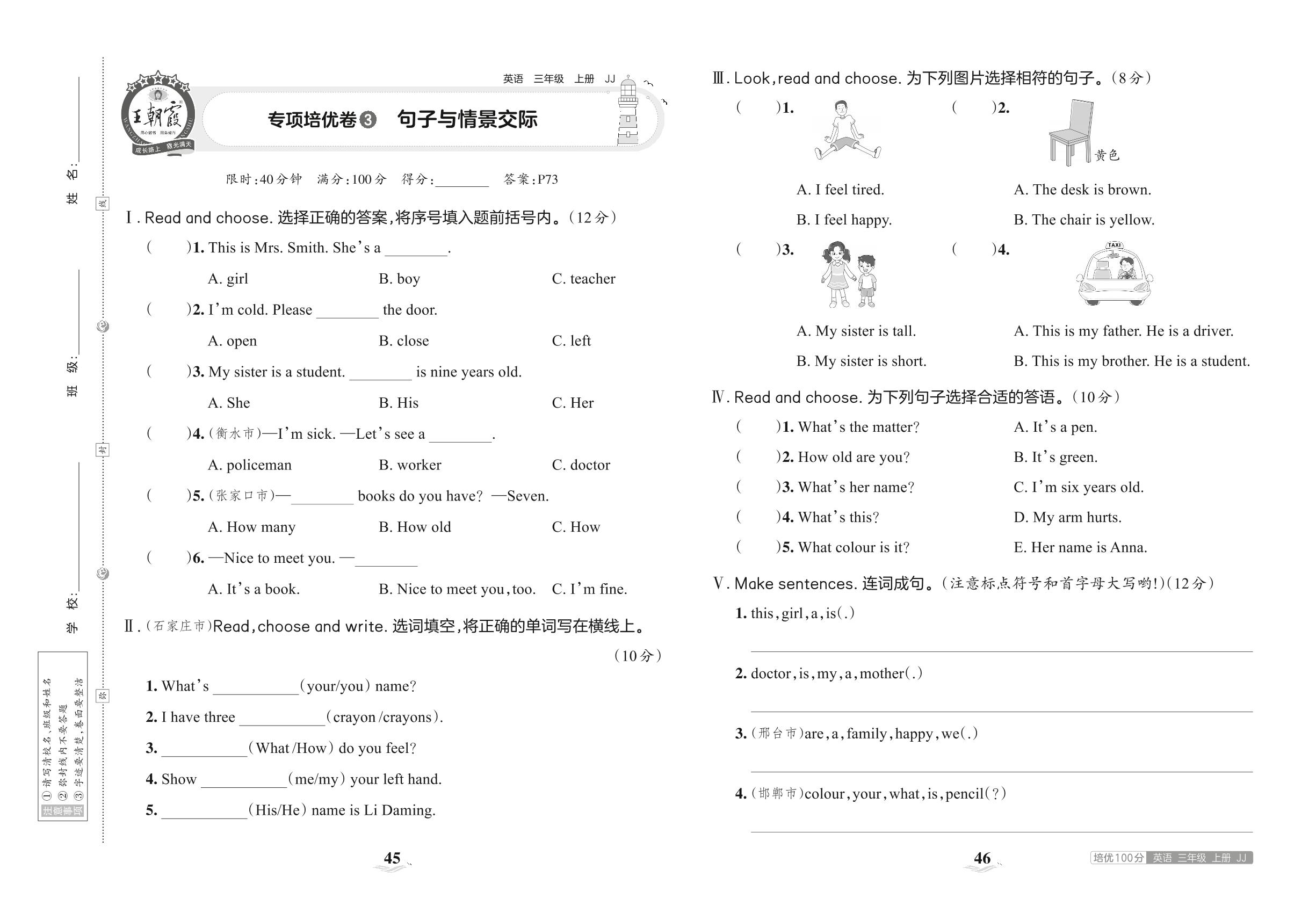 2023上册三年级英语冀教版 专项培优卷 3 句子与情景交际