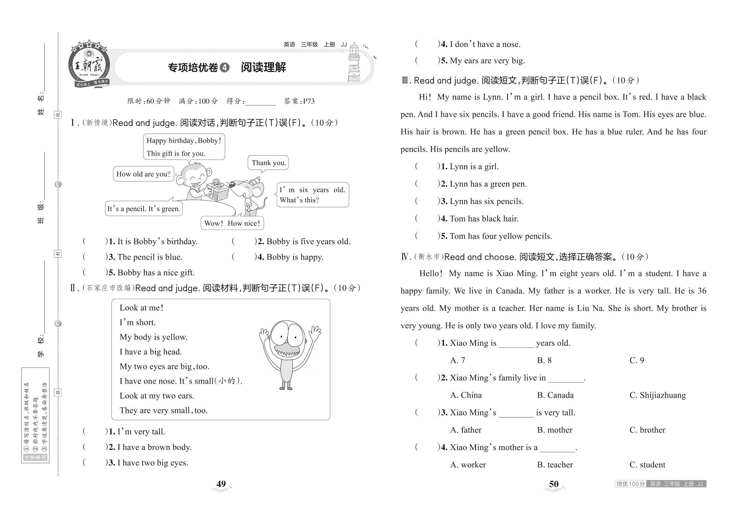 2023上册三年级英语冀教版 专项培优卷 4 阅读理解
