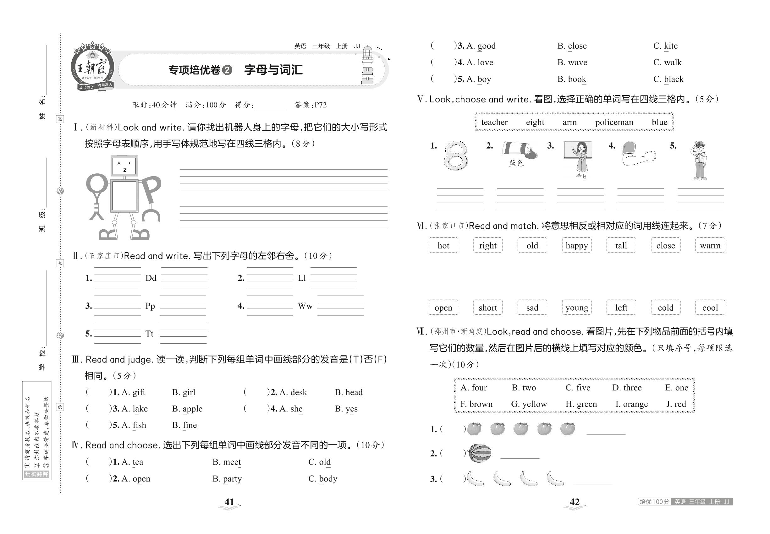 2023上册三年级英语冀教版 专项培优卷 2 字母与词汇
