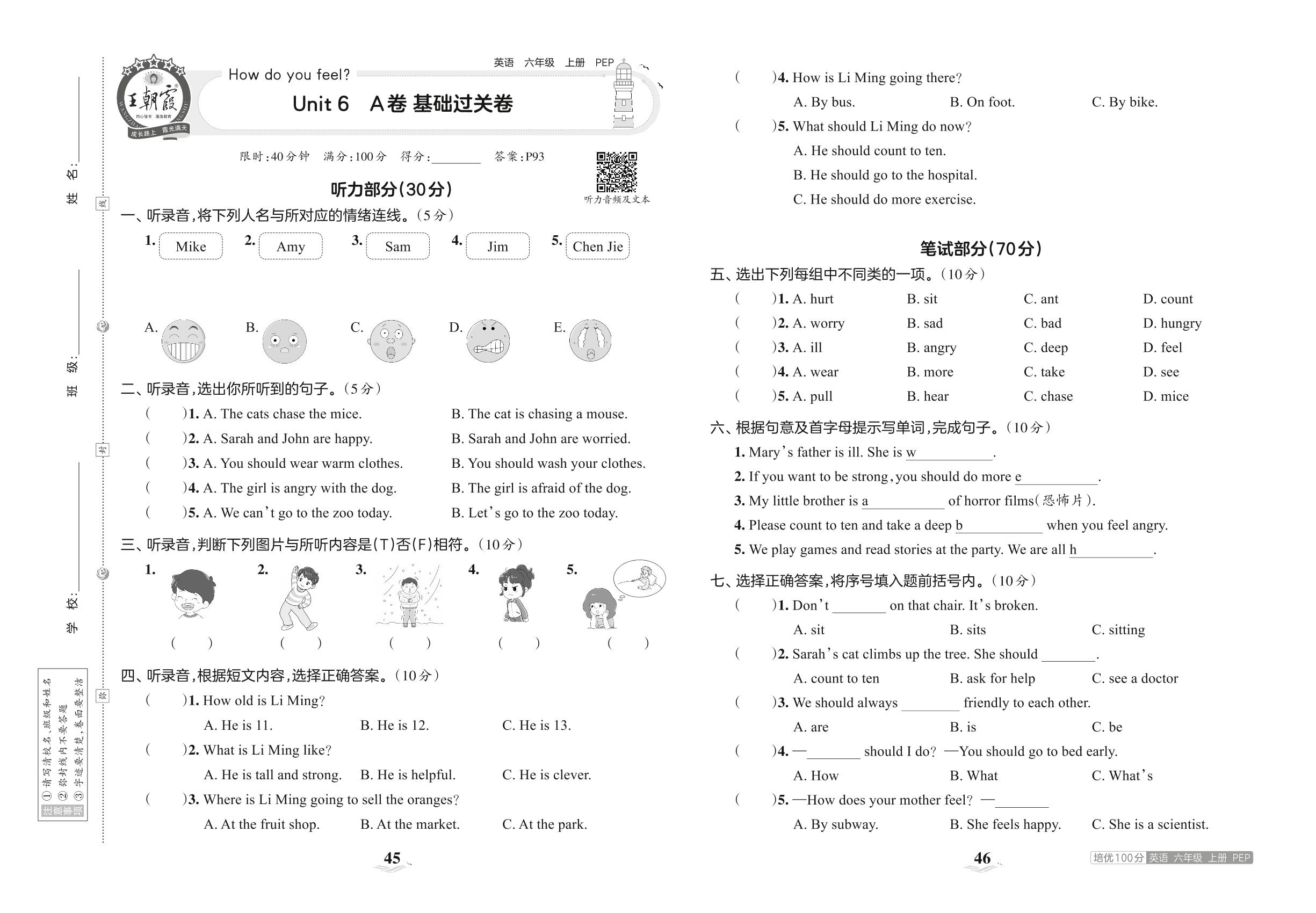 2023上册六年级英语人教PEP版 Unit 6 A卷 基础过关卷