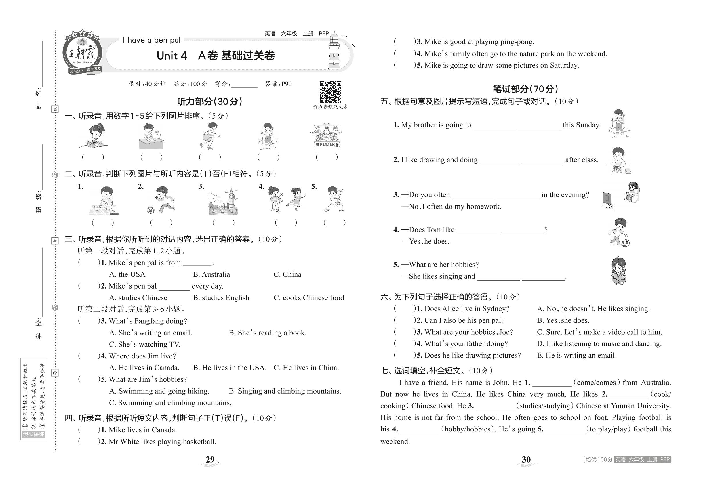 2023上册六年级英语人教PEP版 Unit 4 A卷 基础过关卷