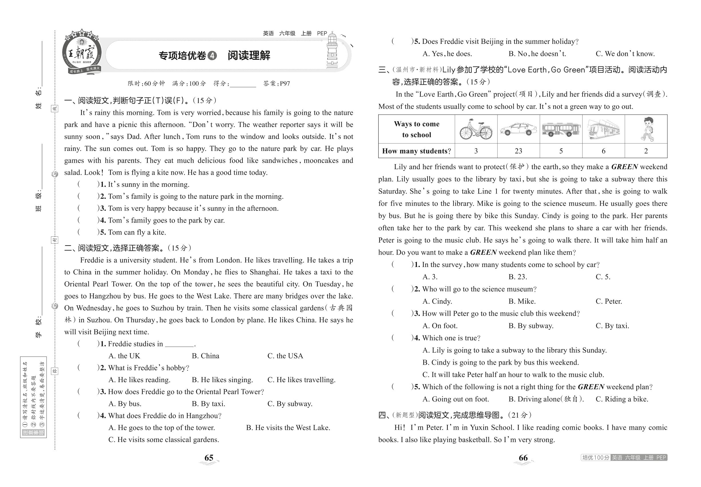 2023上册六年级英语人教PEP版 专项培优卷 4 阅读理解