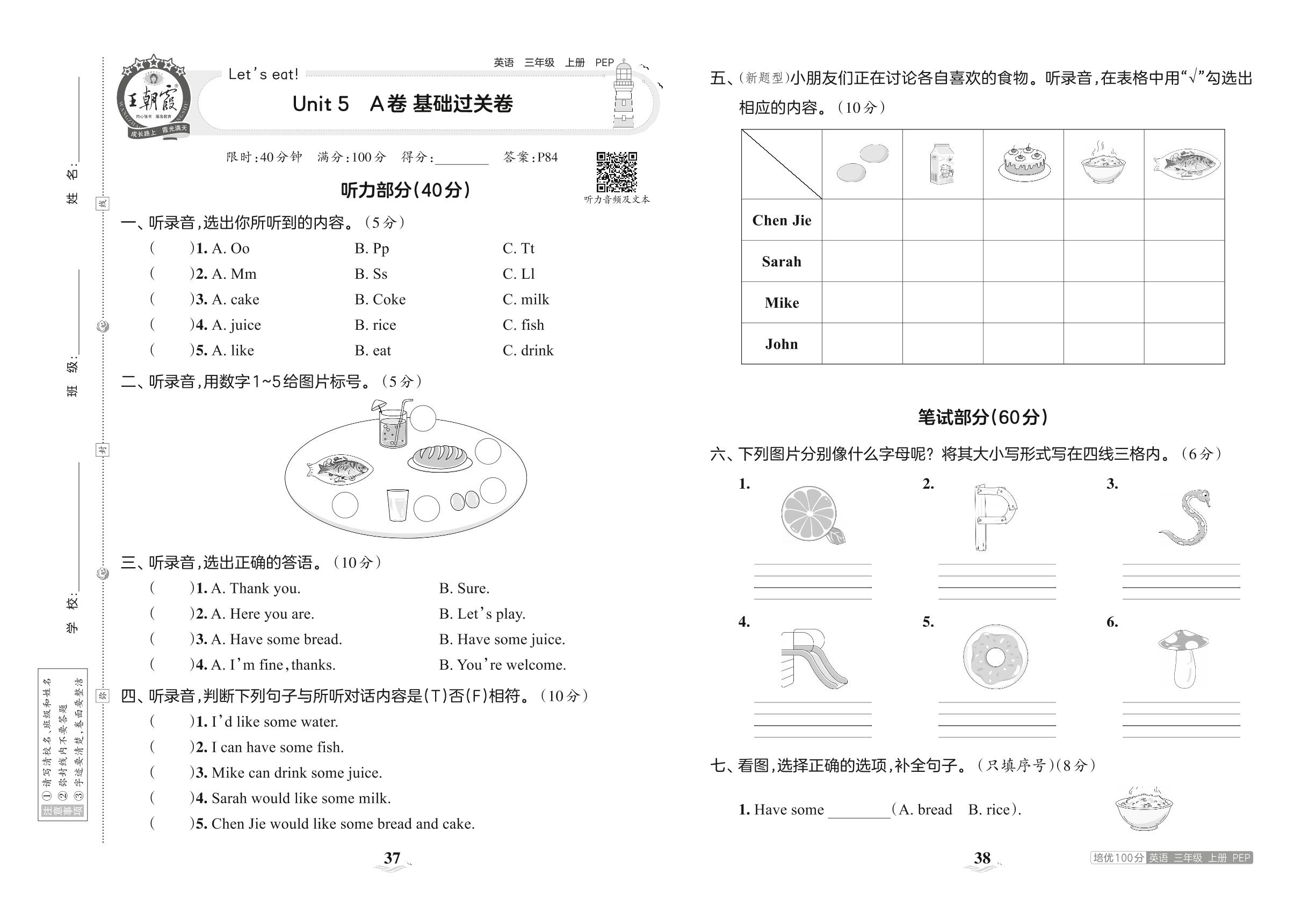 2023上册三年级英语人教PEP版 Unit 5 A卷 基础过关卷