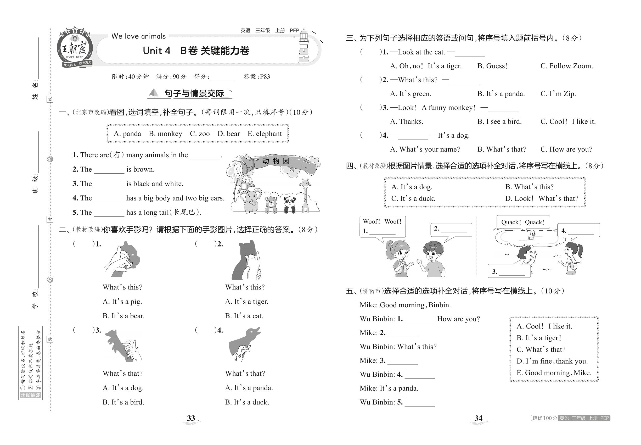 2023上册三年级英语人教PEP版 Unit 4 B卷 关键能力卷