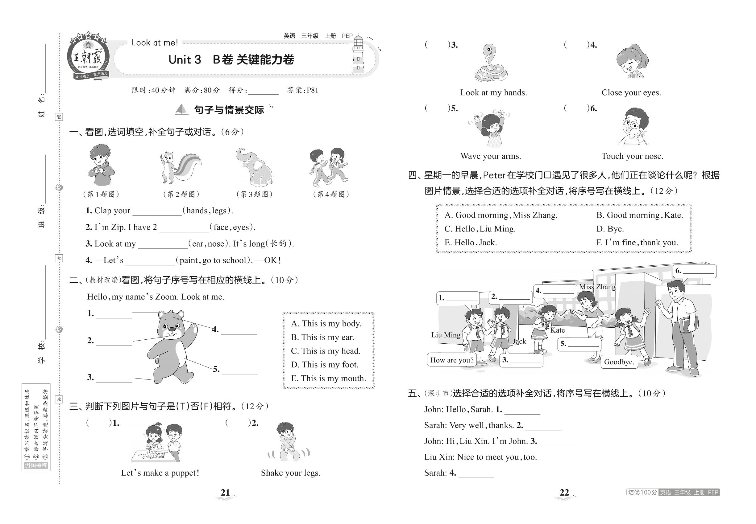 2023上册三年级英语人教PEP版 Unit 3 B卷 关键能力卷