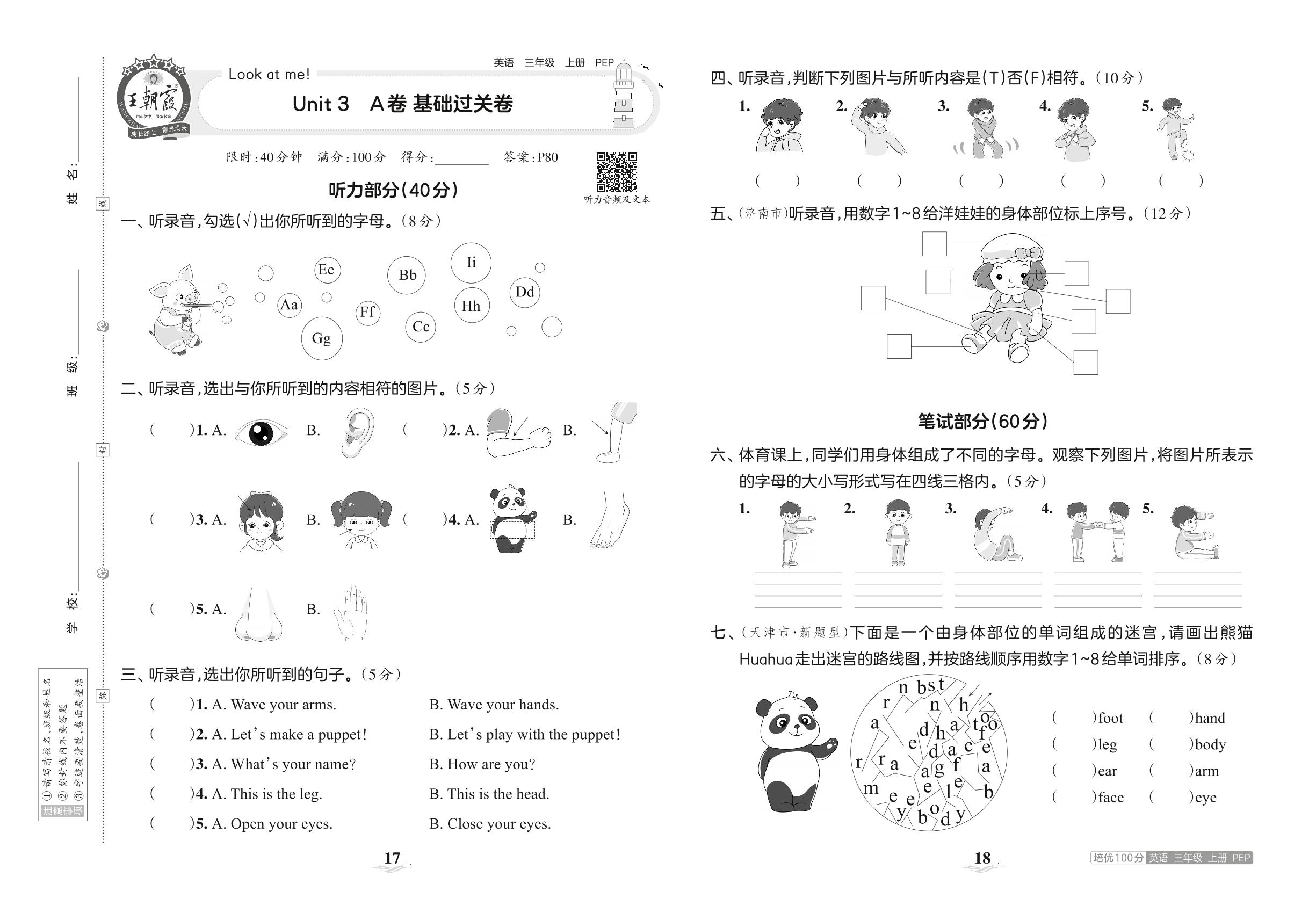 三年级英语人教PEP版(三起始)上册单元卷