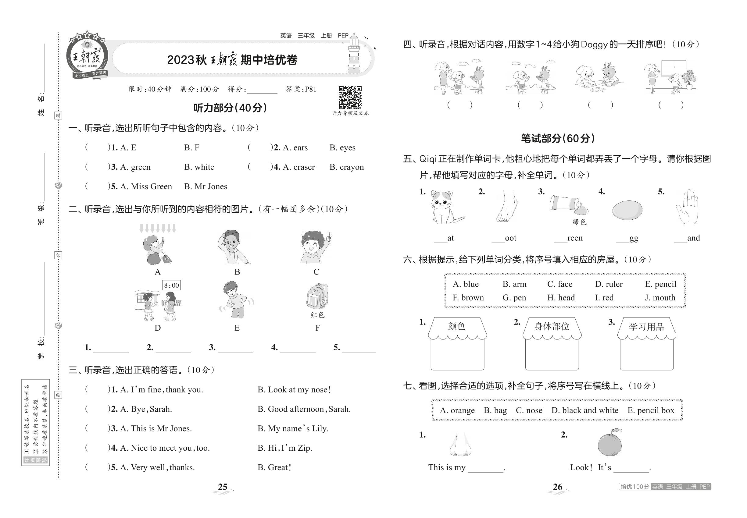 2023上册三年级英语人教PEP版 2023秋王朝霞期中培优卷