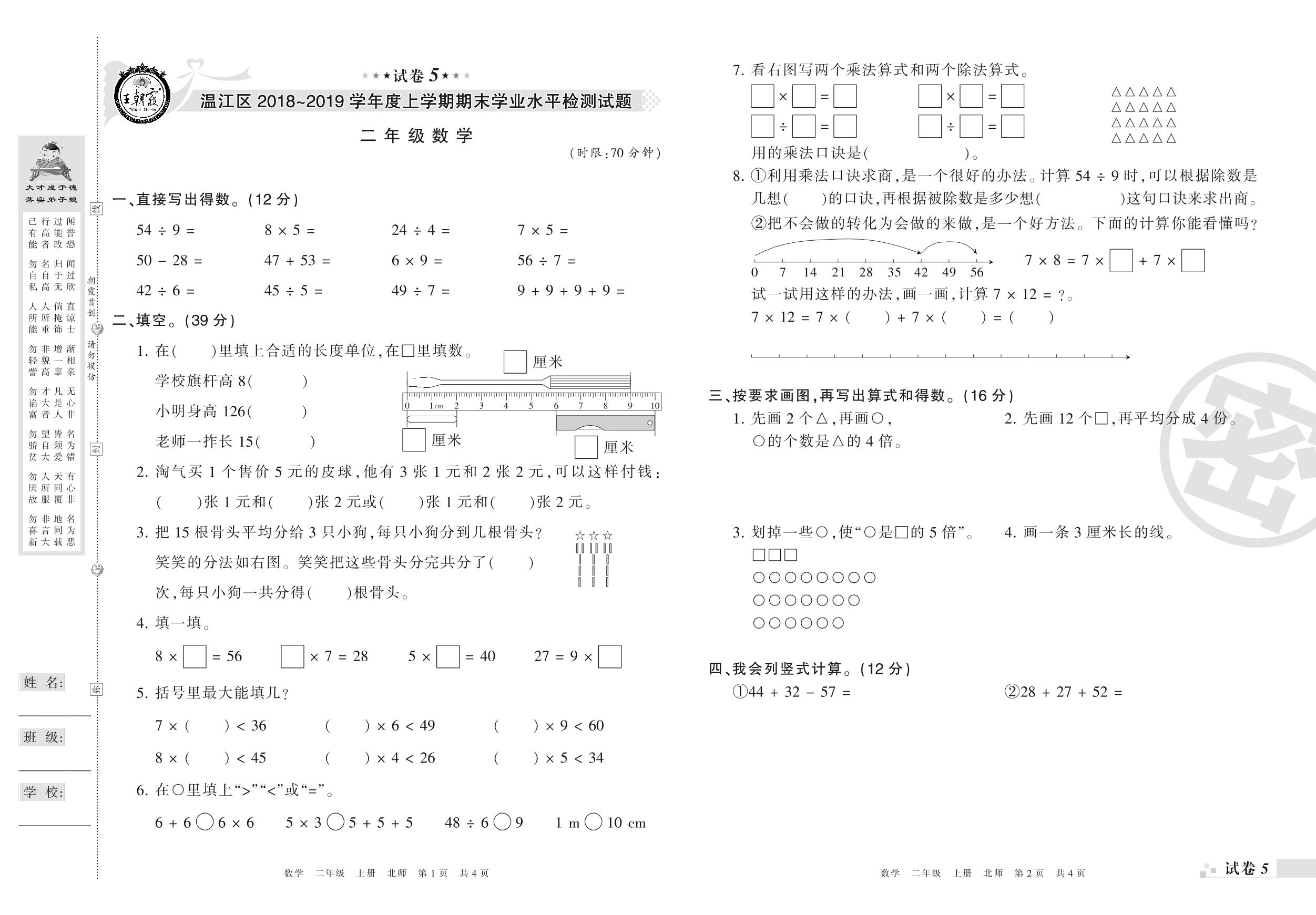 2018-2019学年第一学期成都市温江区二年级数学试卷(北师版)【5】