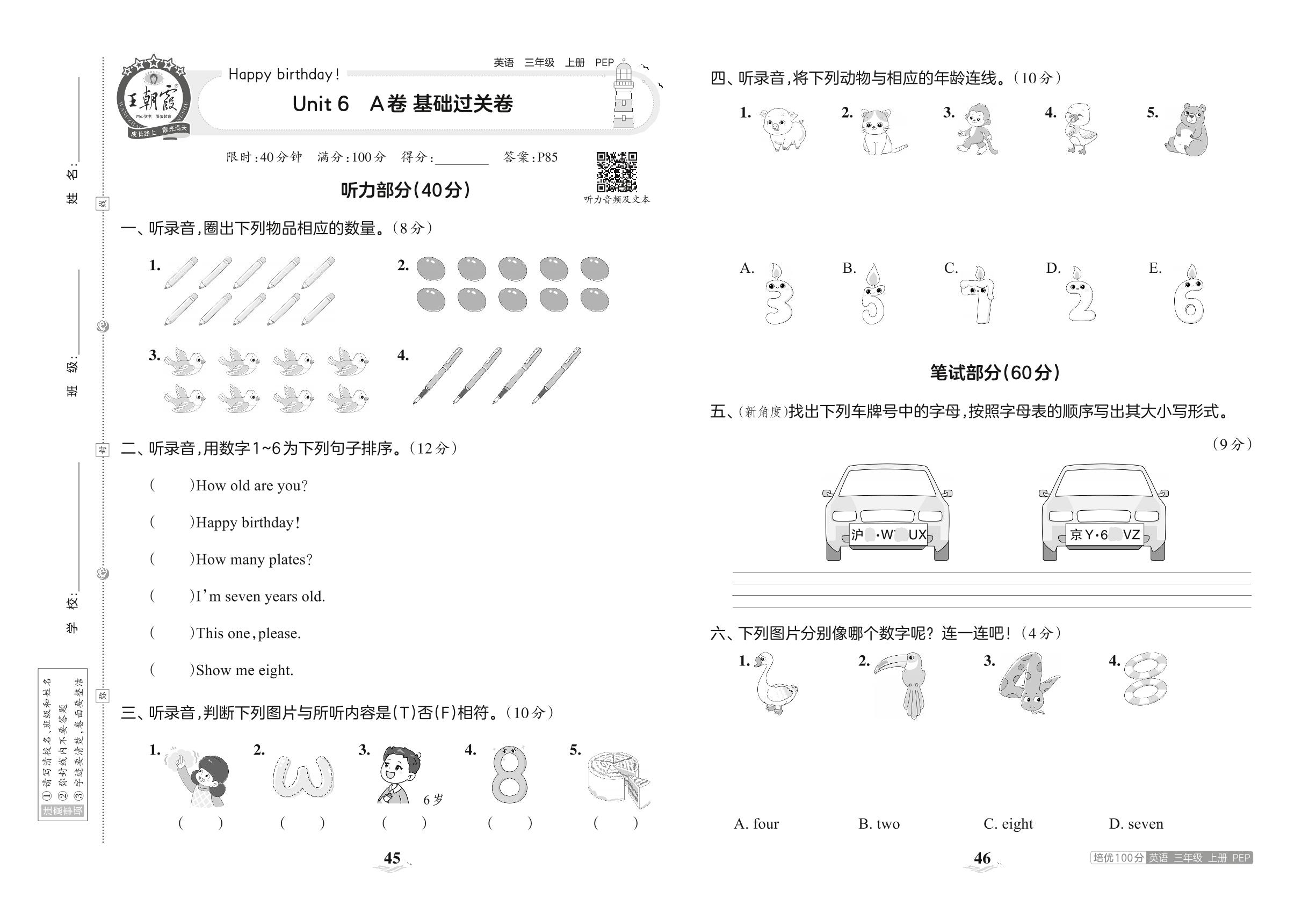 2023上册三年级英语人教PEP版 Unit 6 A卷 基础过关卷