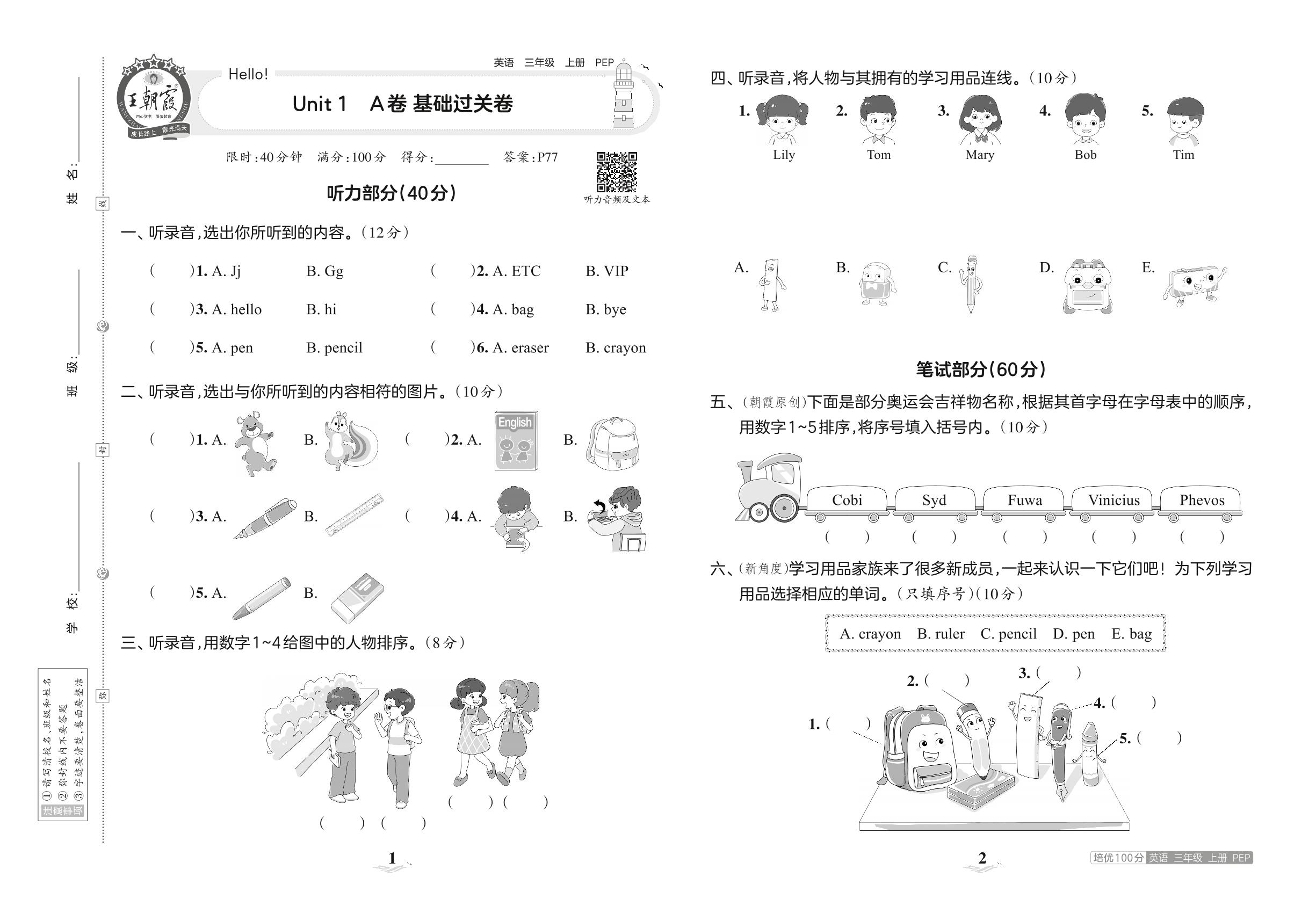 三年级英语人教PEP版(三起始)上册单元卷