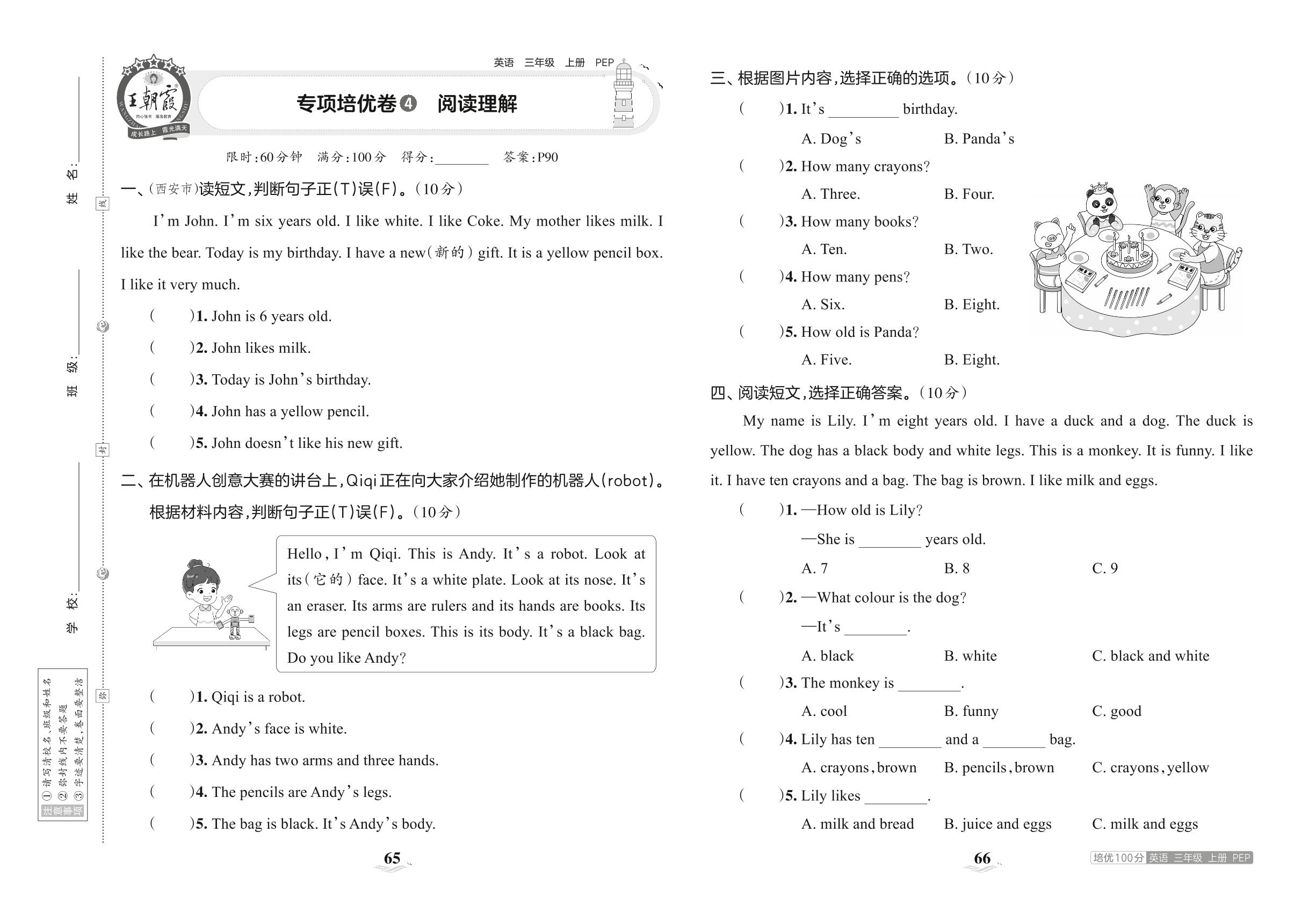 2023上册三年级英语人教PEP版 专项培优卷 4 阅读理解