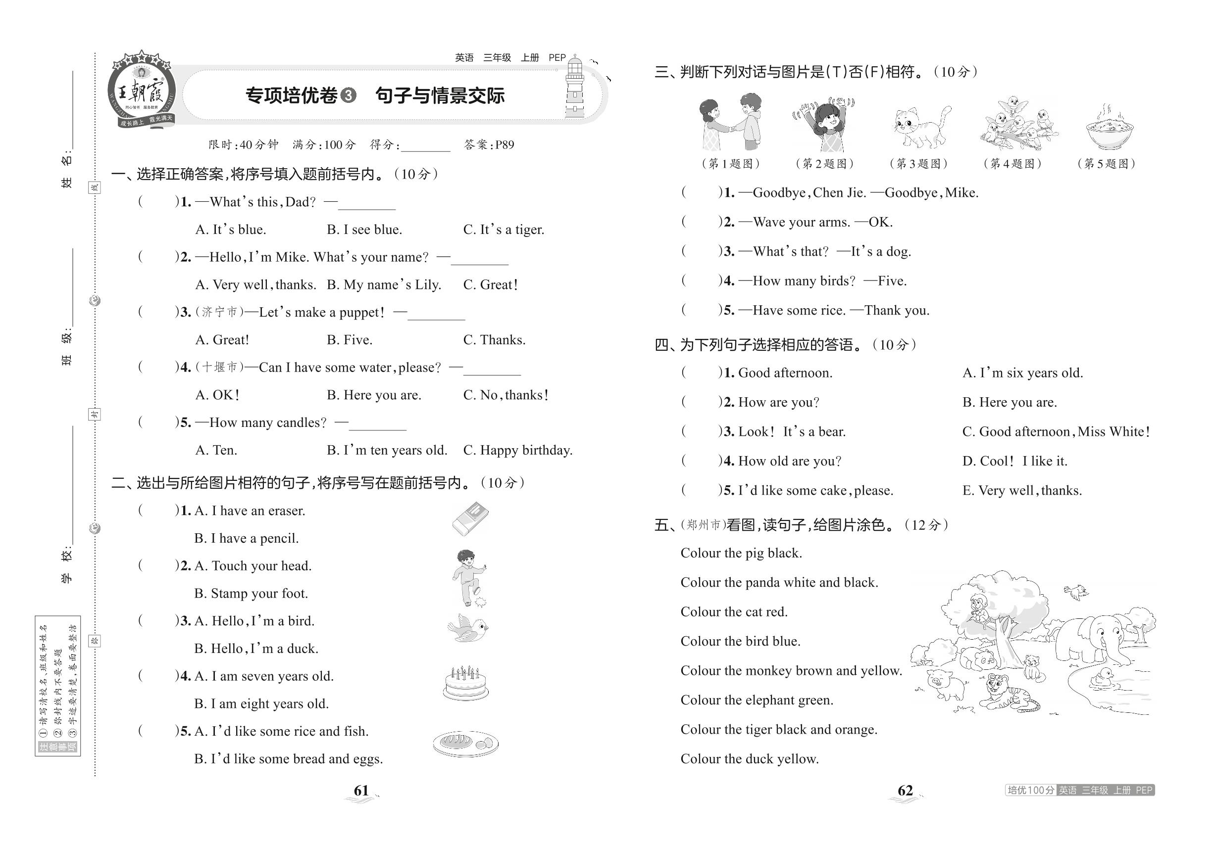 2023上册三年级英语人教PEP版 专项培优卷 3 句子与情景交际