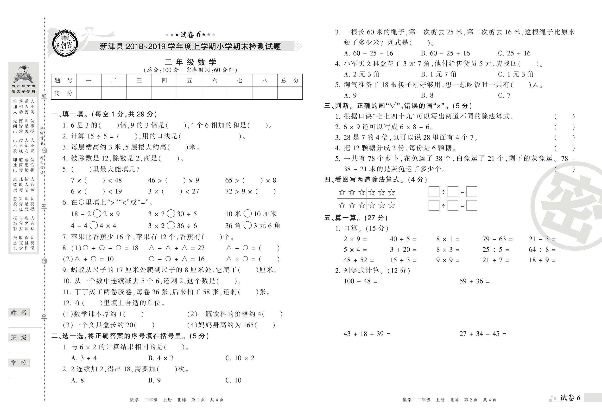 2018-2019学年第一学期成都市新津县二年级数学试卷(北师版)【6】