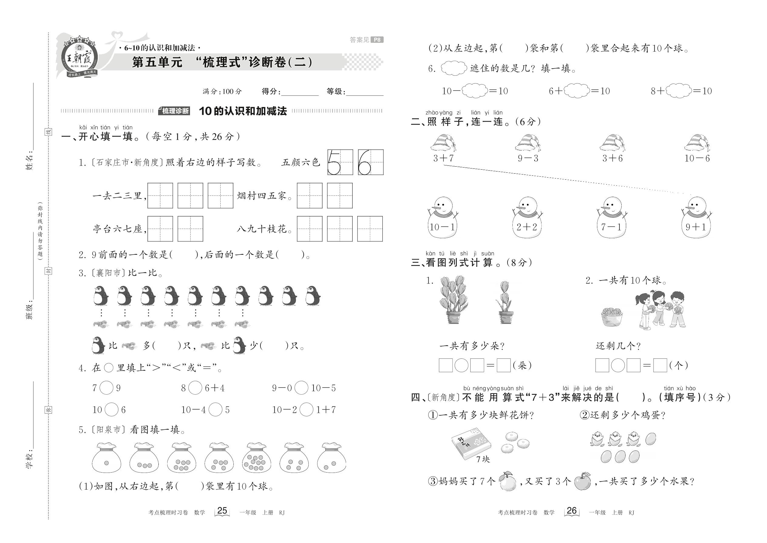 2023上册一年级数学人教版 第五单元 “梳理式”诊断卷(二)