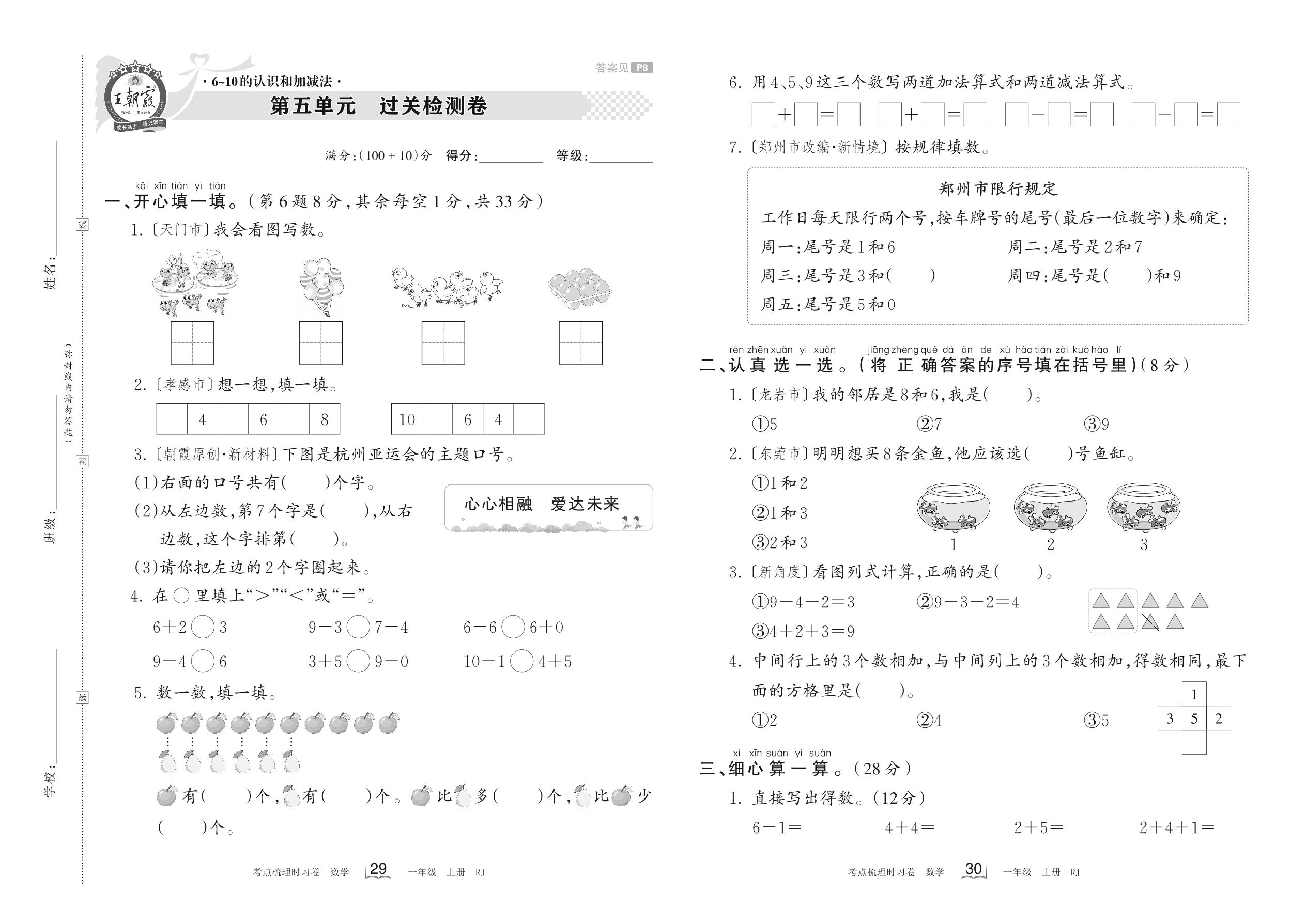 2023上册一年级数学人教版 第五单元 过关检测卷