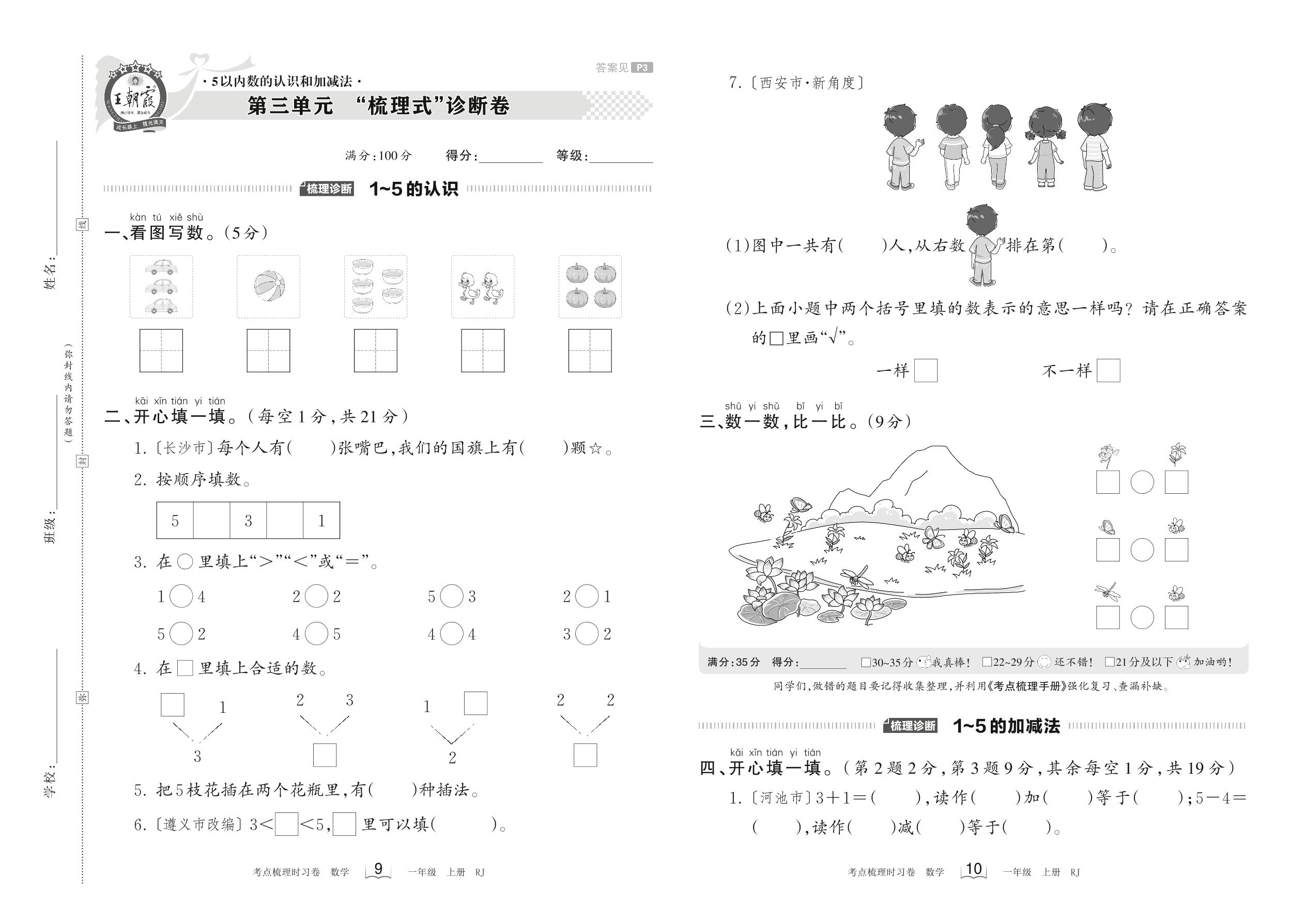 2023上册一年级数学人教版 第三单元 “梳理式”诊断卷