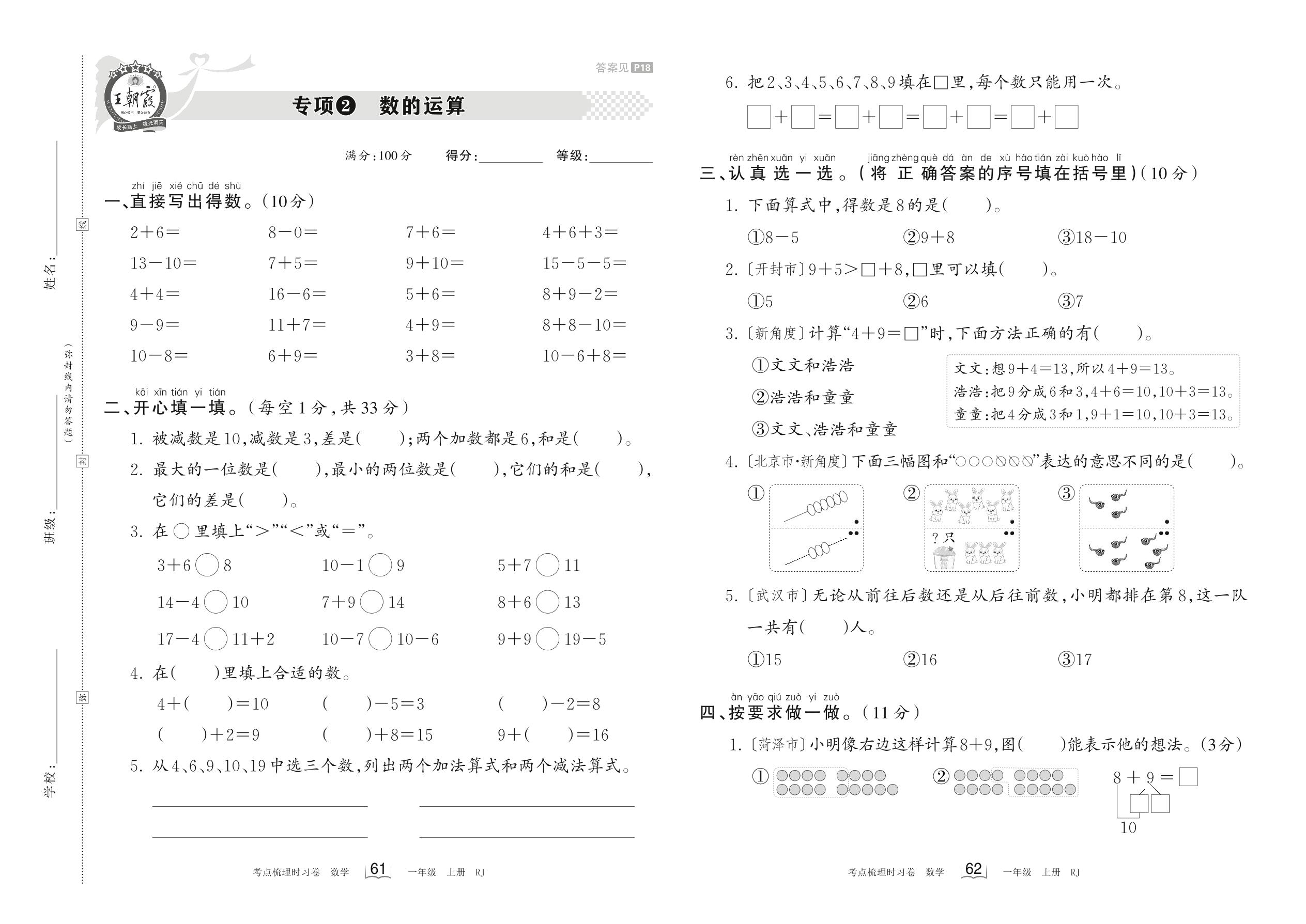 2023上册一年级数学人教版 专项2 数的运算