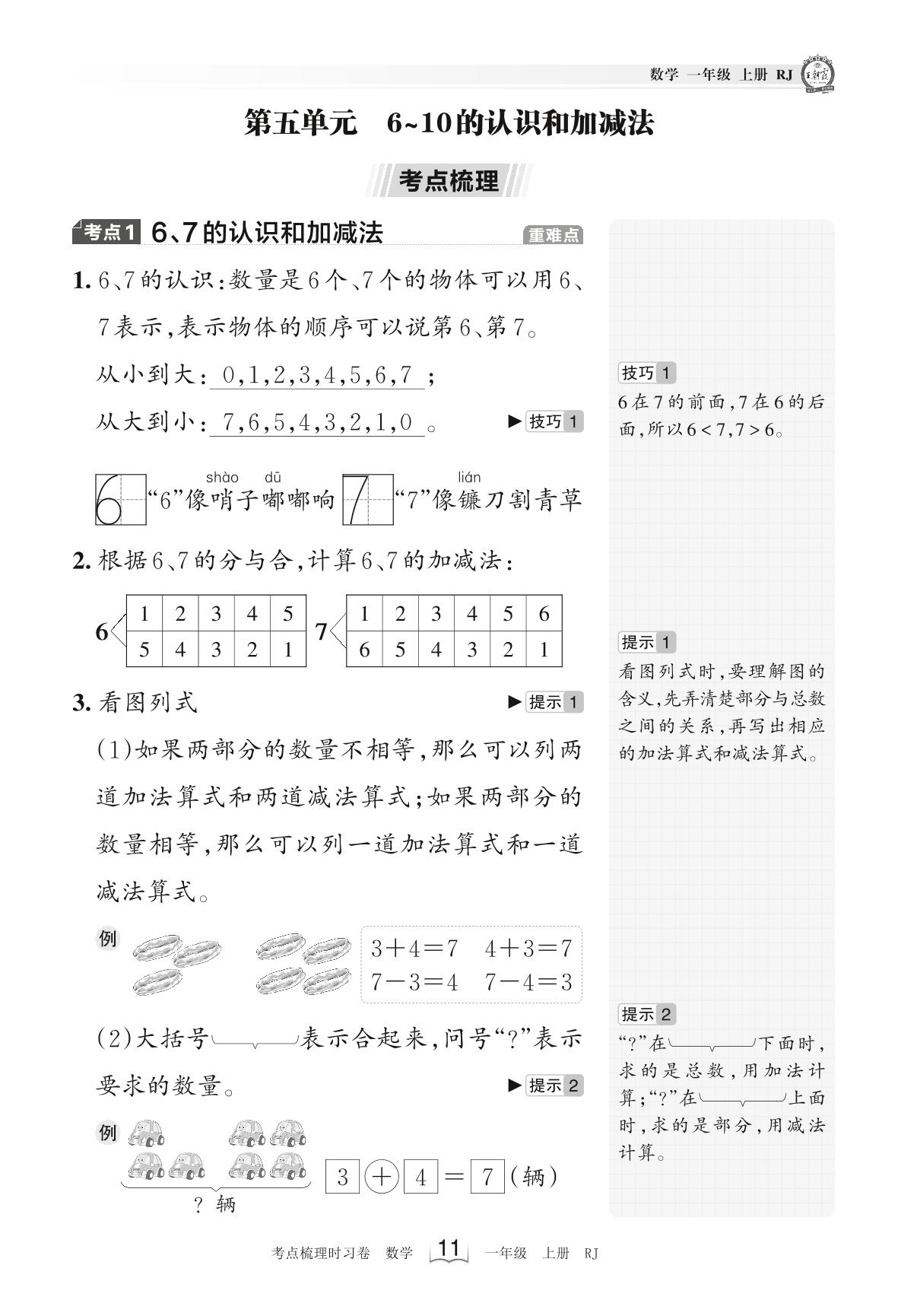 2023上册一年级数学人教版 考点梳理手册——第五单元 6~10的认识和加减法
