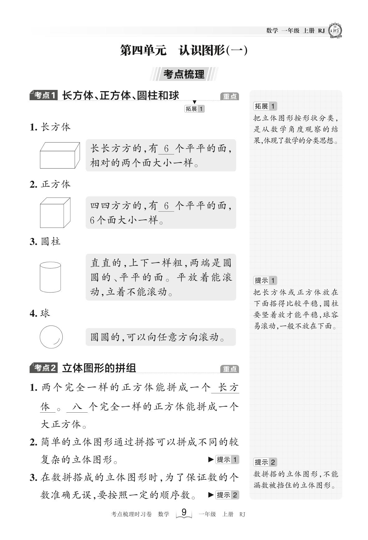2023上册一年级数学人教版 考点梳理手册——第四单元 认识图形(一)