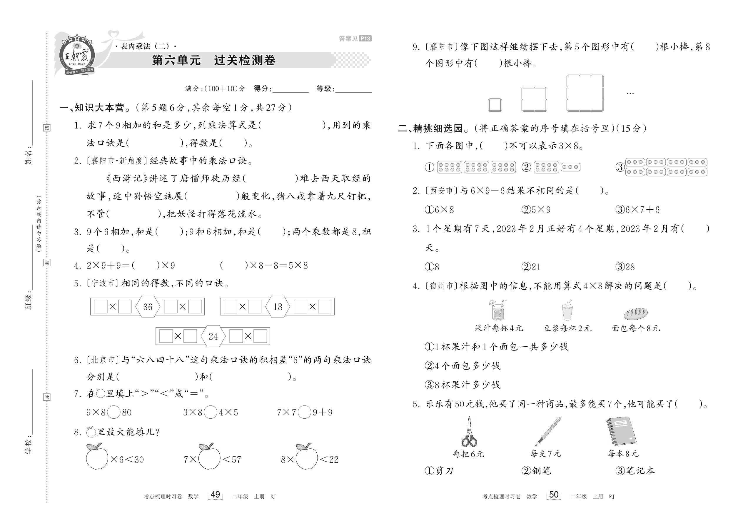 2023上册二年级数学人教版 第六单元 过关检测卷