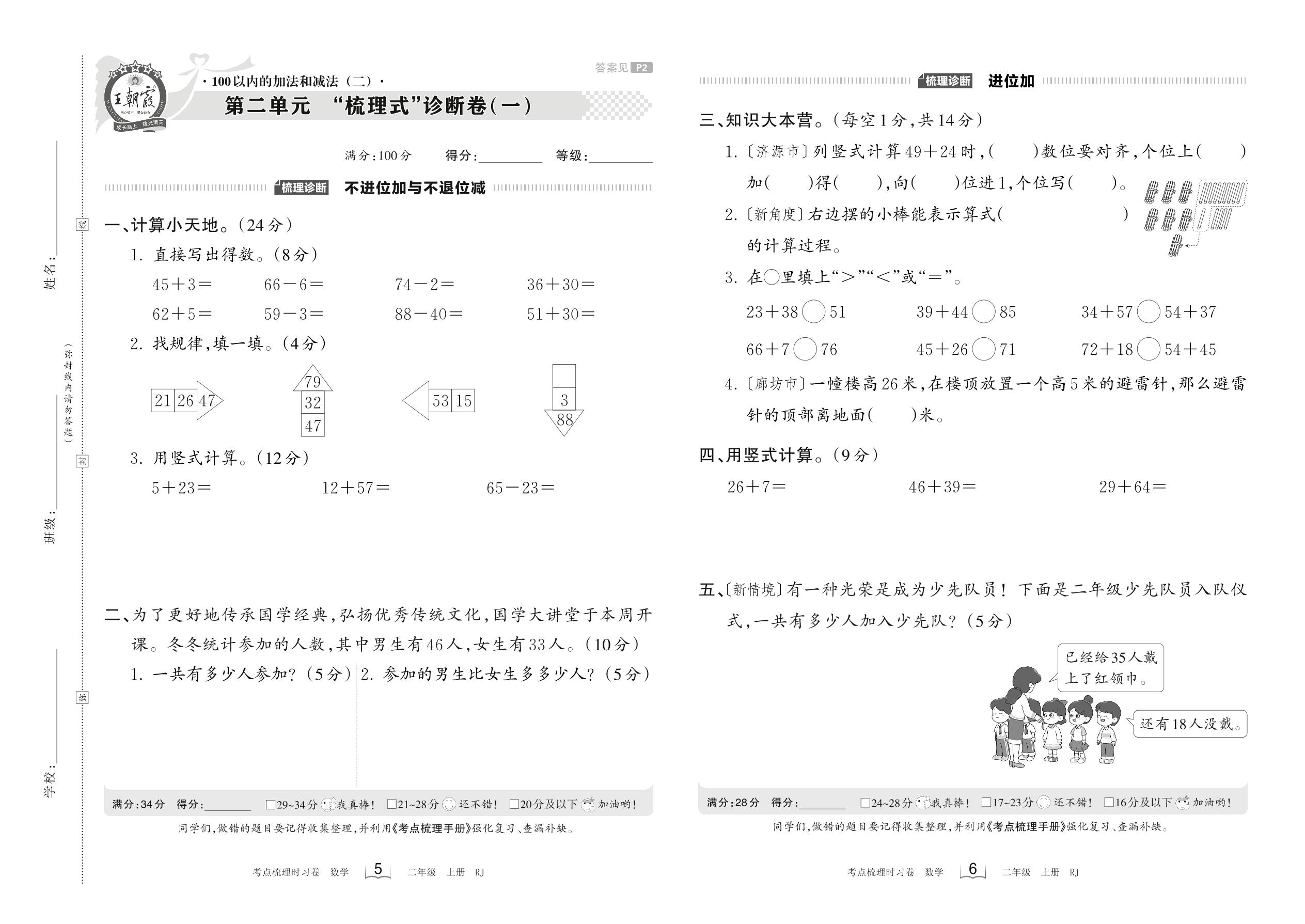 2023上册二年级数学人教版 第二单元 “梳理式”诊断卷(一)