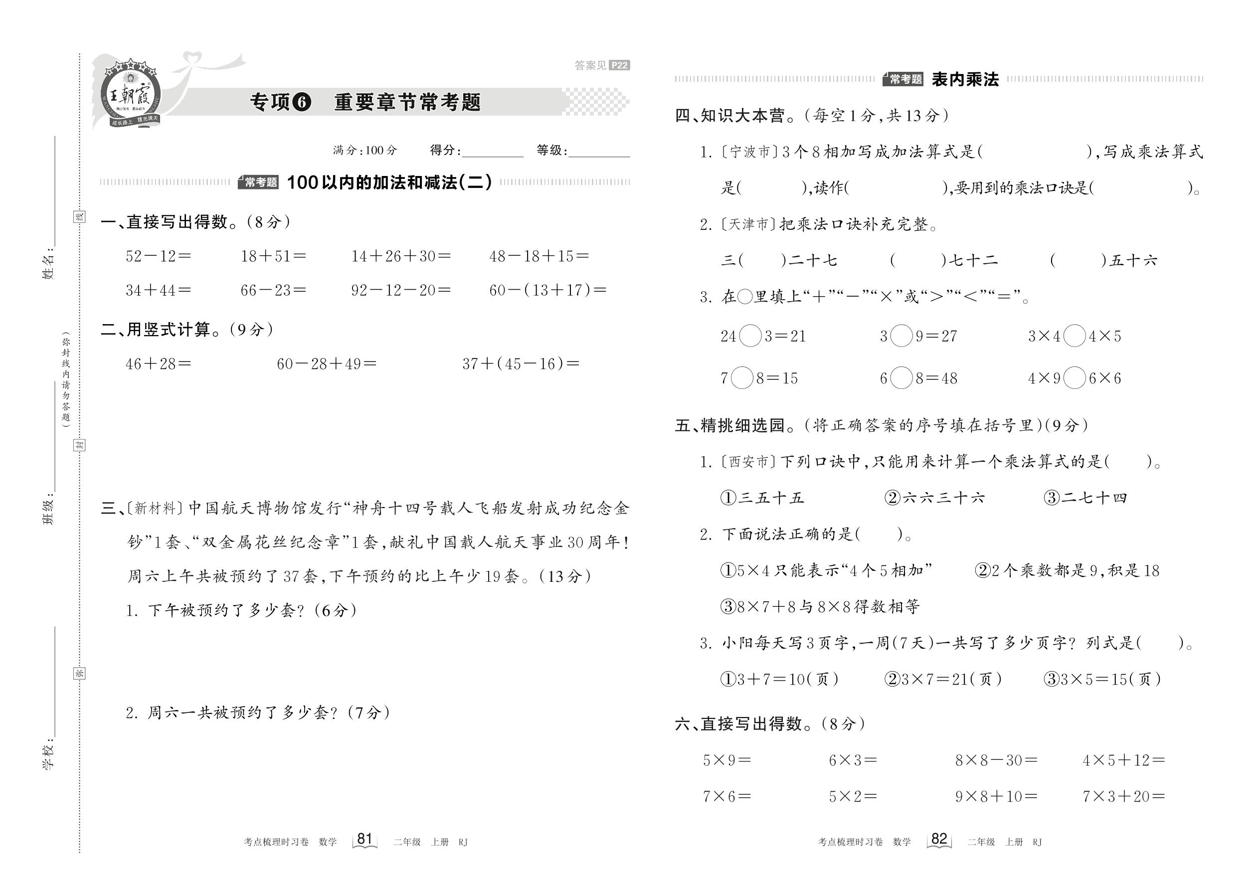 2023上册二年级数学人教版 专项6 重要章节常考题