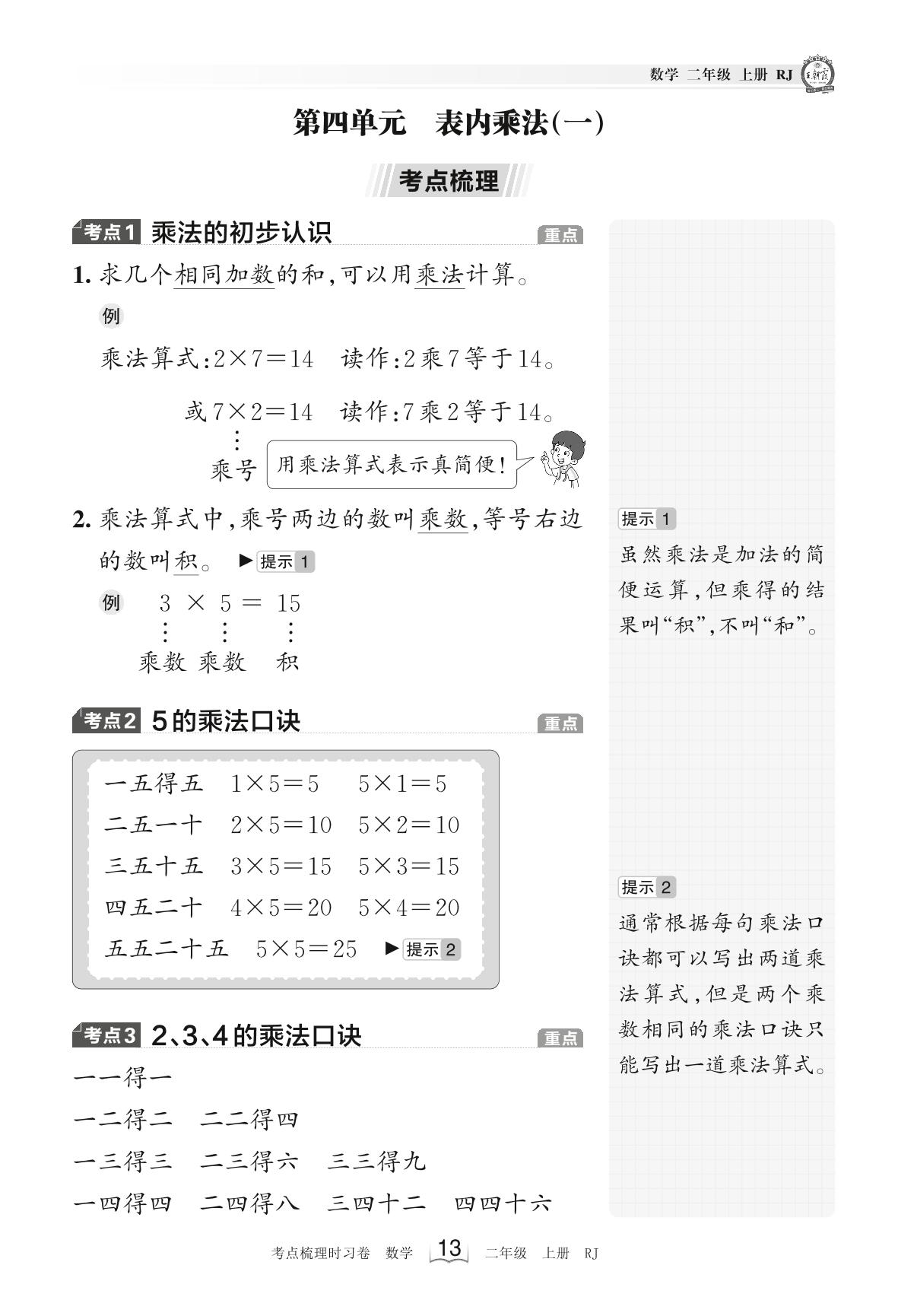 2023上册二年级数学人教版 考点梳理手册——第四单元 表内乘法(一)