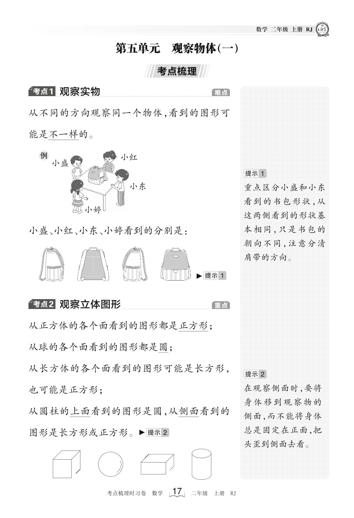 2023上册二年级数学人教版 考点梳理手册——第五单元 观察物体(一)