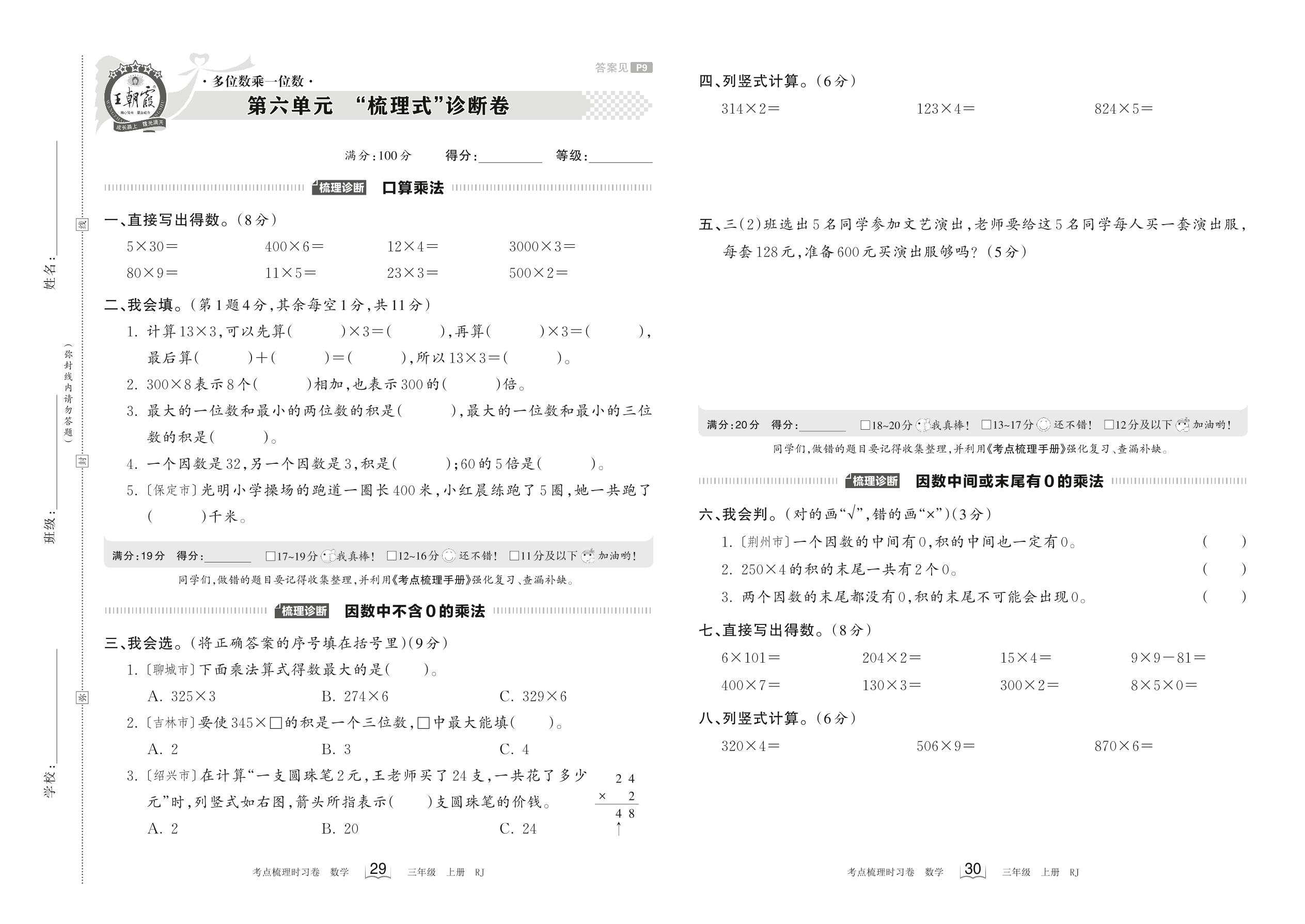 2023上册三年级数学人教版 第六单元 “梳理式”诊断卷