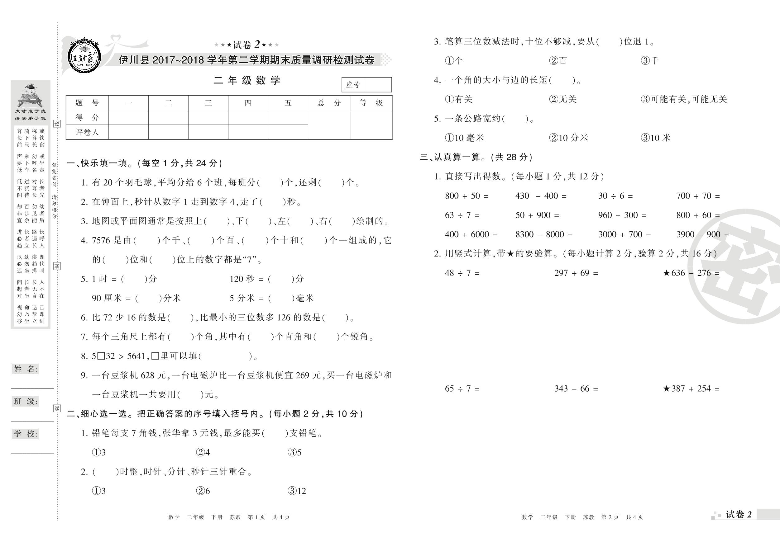 2017-2018学年第二学期洛阳市伊川县二年级数学试卷(苏教版)【2】