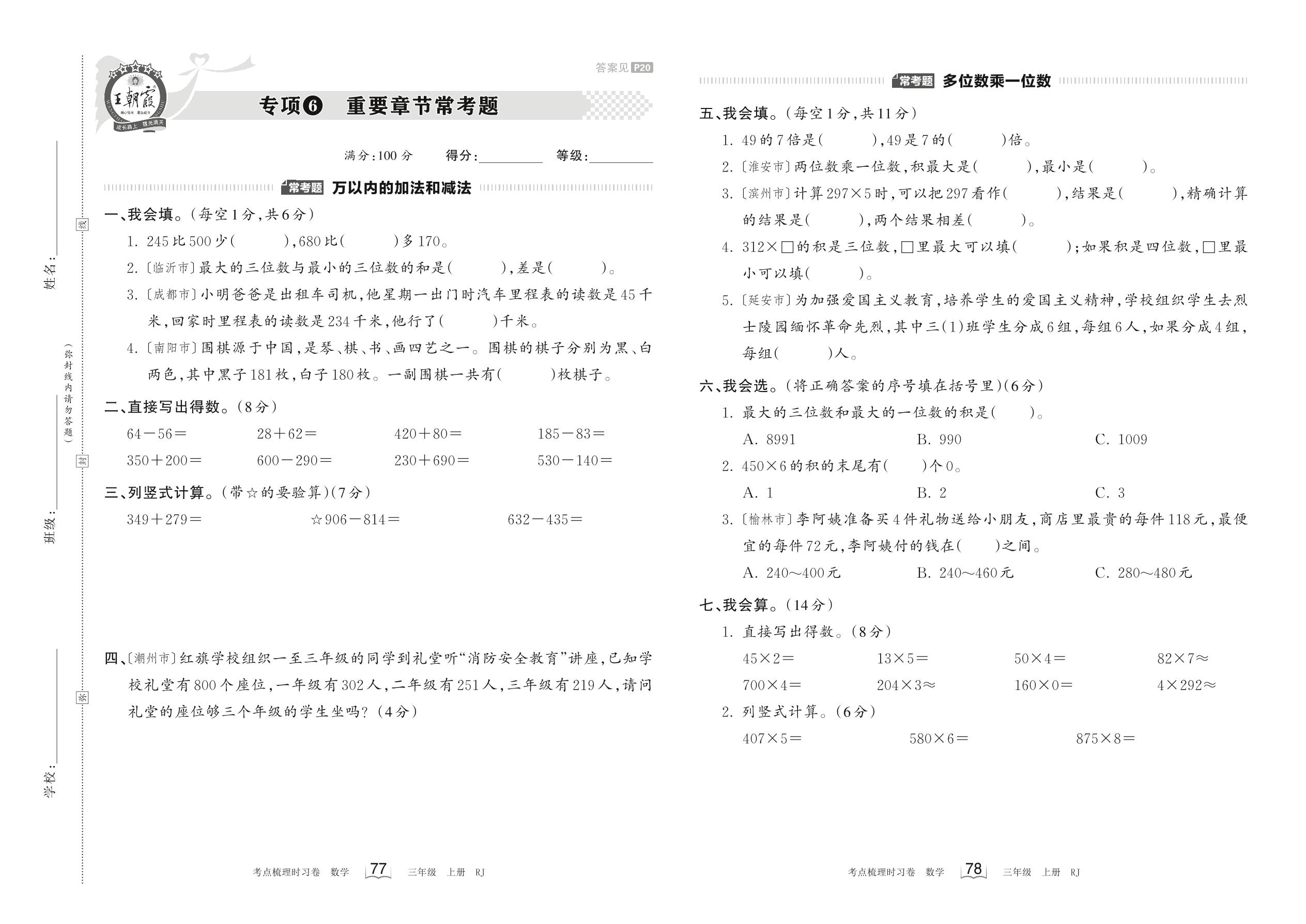 2023上册三年级数学人教版 专项6 重要章节常考题